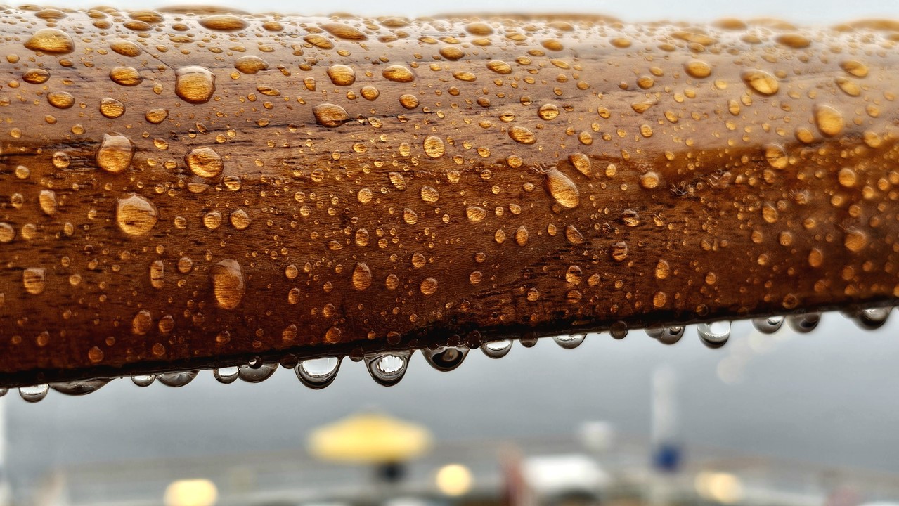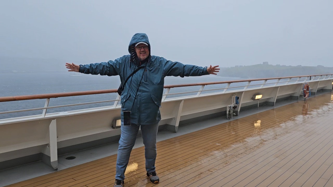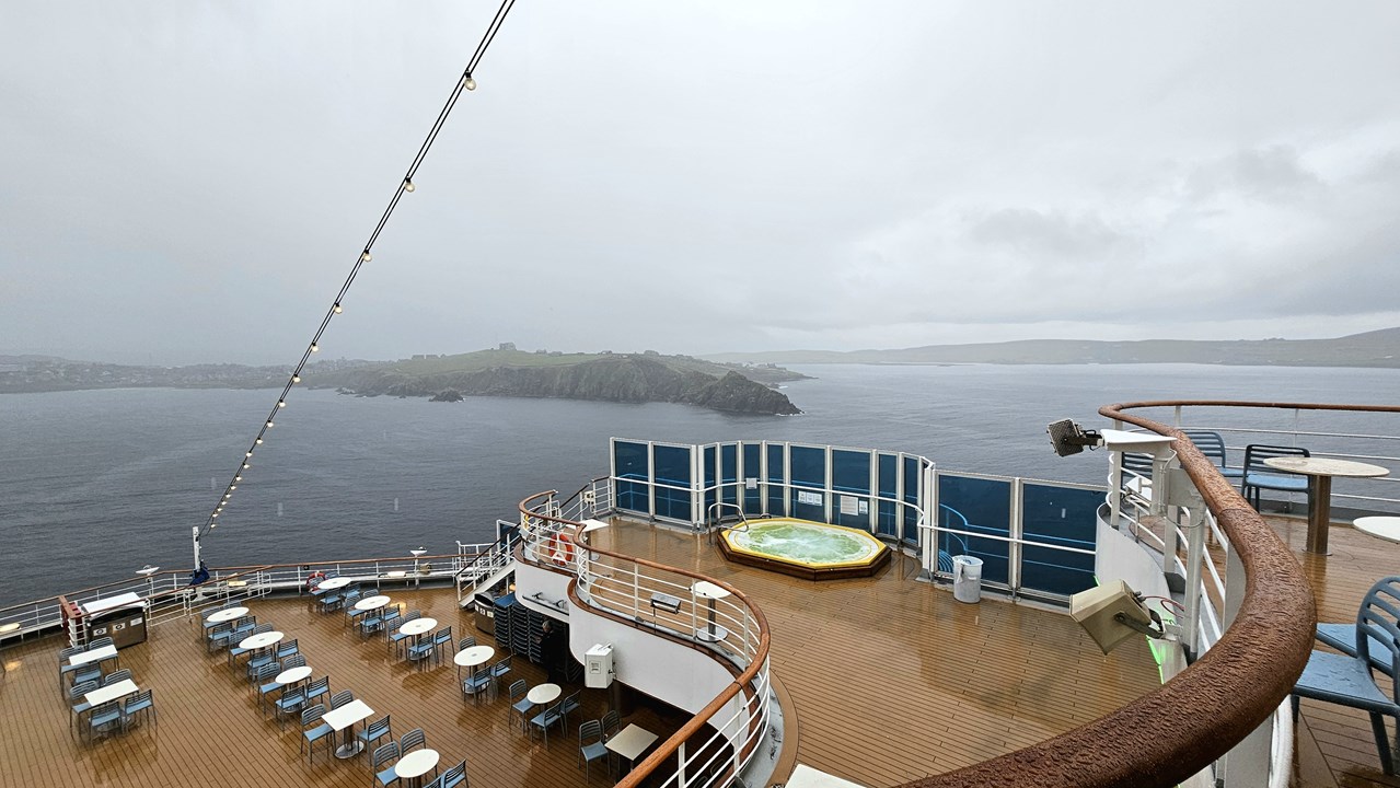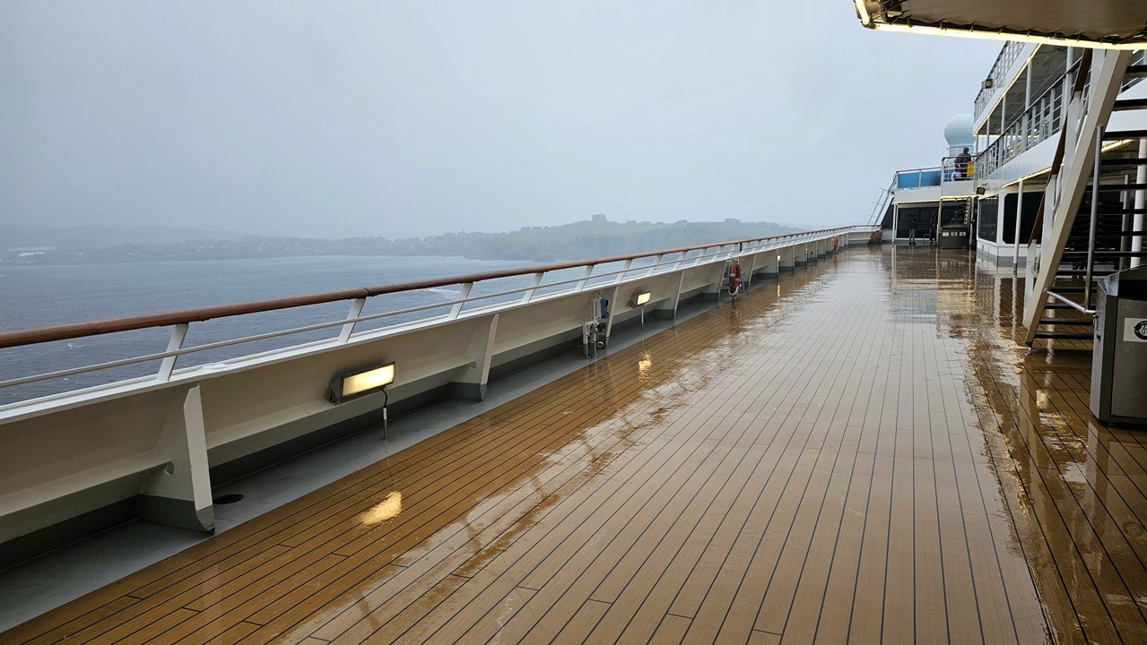 Wir haben ja noch viel Zeit. Unser Tenderboot 56 ist noch weit entfernt. Daher schlendern wir ein wenig über das Pooldeck. Aber nicht lange, es regnet ohne Unterlass. Und windig wird es auch. Das wird sicher eine wacklige Überfahrt mit dem Tender.