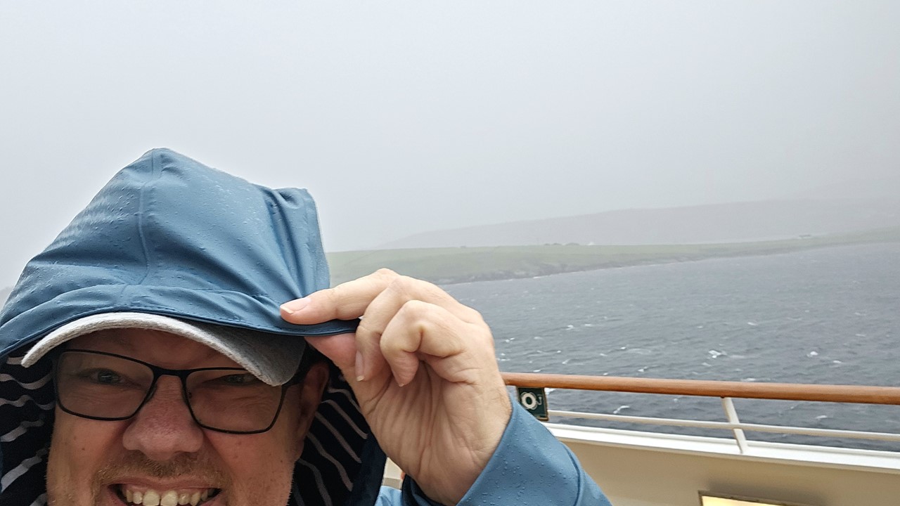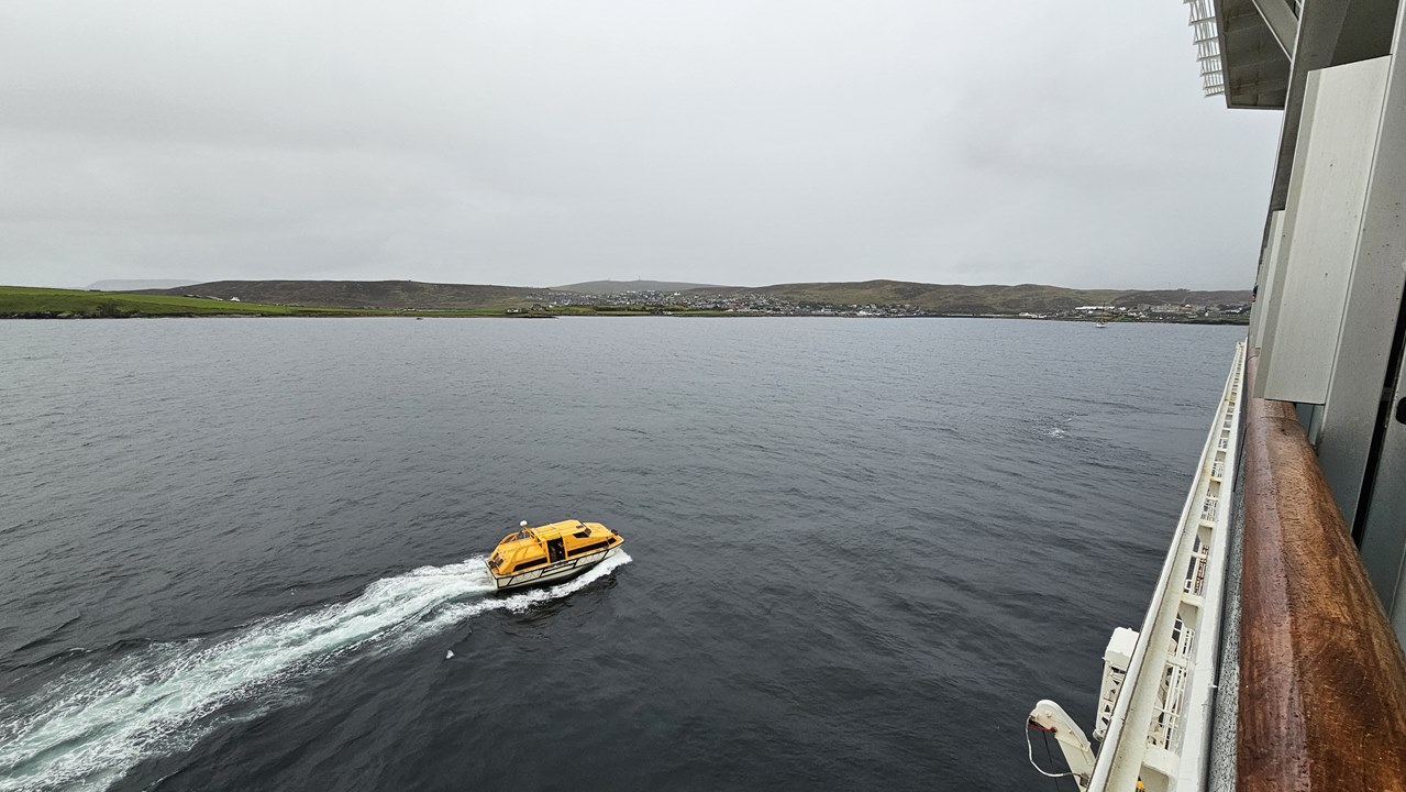 Guten Morgen aus Lerwick von den Shetland Inseln. Schon kurz nach 7 Uhr liegen wir auf Reede vor Lerwick. Ein Blick vom Balkon zeigt: Die Welt liegt grau in grau vor uns. Das sieht momentan nicht wirklich einladend aus. Okay, dann gehen wir erst mal frühstücken. Wir beobachten noch kurz wie die Tenderboote vorbereitet werden, dann machen wir uns auf zum Frühstück.