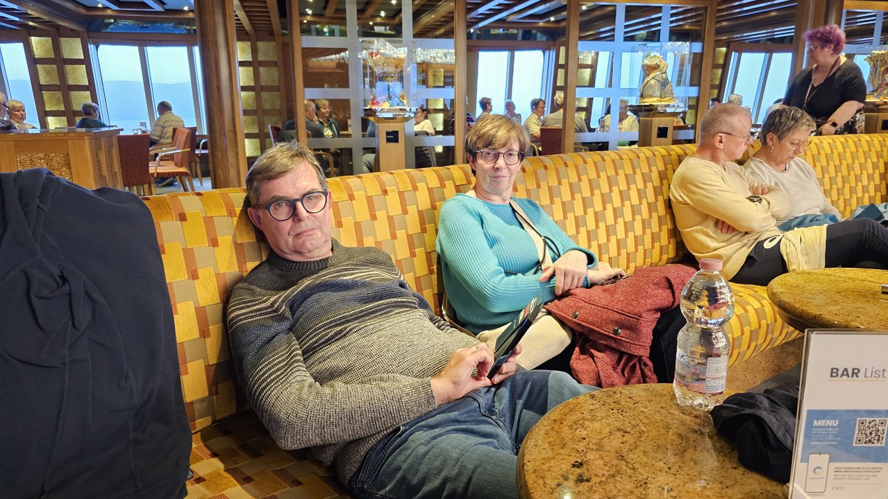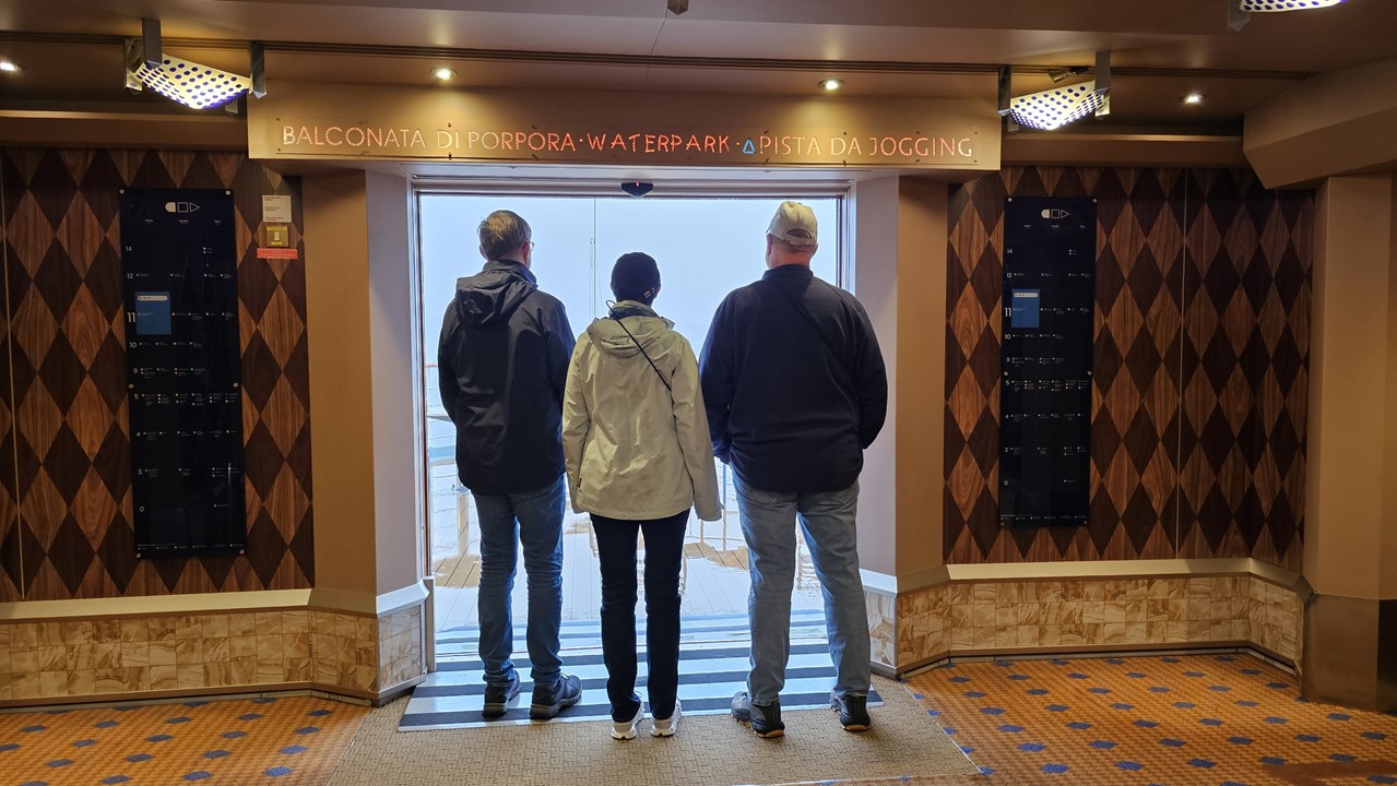Irgendwann verschlägt es uns zum Warten in die Grand Bar Palatino. So wie viele andere Passagiere auch. Es dauert und dauert. Zwischendurch wird der Tenderbetrieb aufgrund des schlechten Wetters unterbrochen. Das Schiff muss sogar neu positioniert werden. Es ist jetzt 10:45 Uhr und die Tenderfahrten werden wieder mit Tenderboot 38 und 39 aufgenommen. Unsere Nummer ist noch so weit entfernt, hoffentlich klappt das mit 13 Uhr.