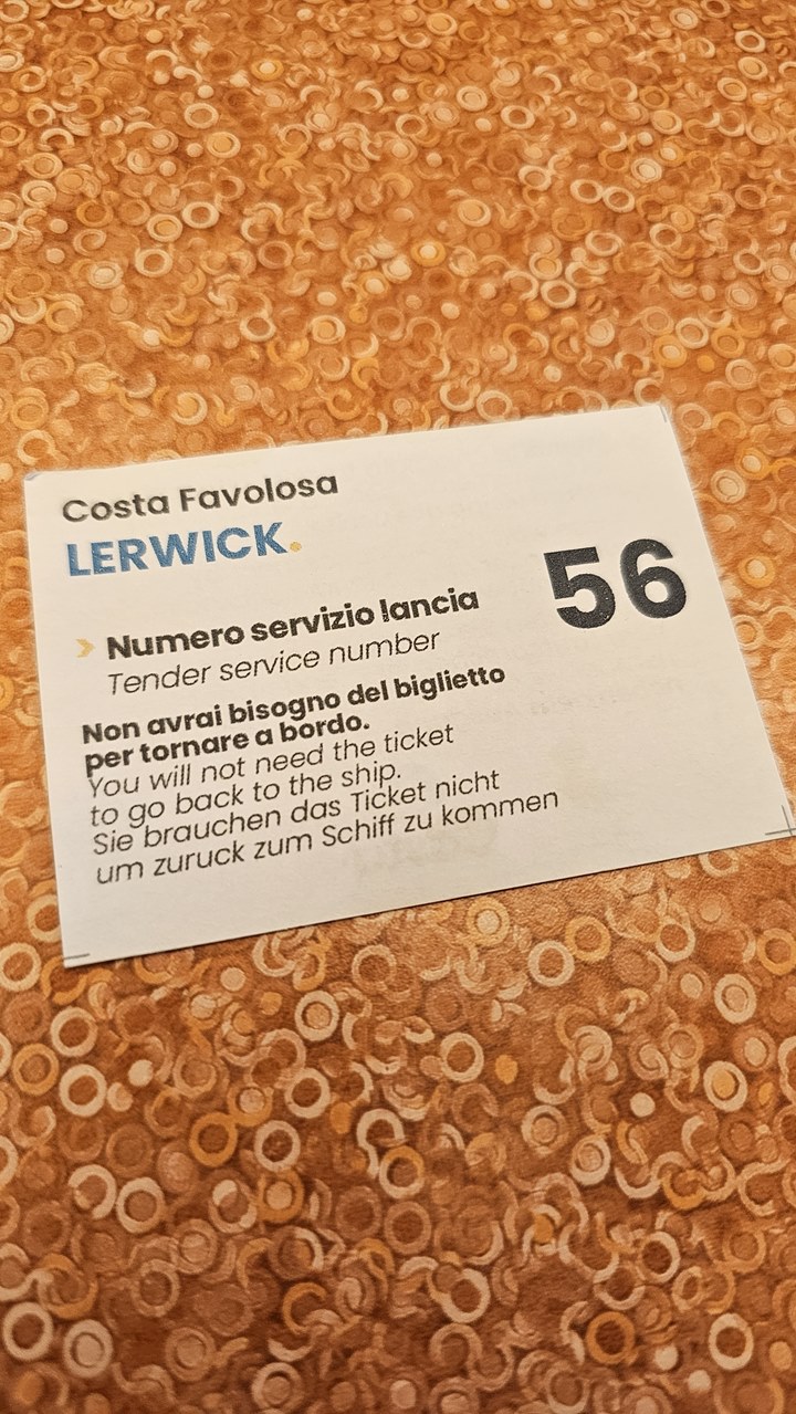 Um 9:30 Uhr stellen wir uns für die Passkontrolle an. Ja, richtig gelesen, Passkontrolle. Die Shetland Inseln gehören zu Schottland und nach dem Brexit gehört Großbritannien und somit auch Schottland nicht mehr zur EU. Das heißt, wir müssen einmal einreisen. Gleichzeitig erhält man die Tendertickets, das hatten wir in der Bordzeitung so gelesen. Die Tendertickets haben Nummern. Sobald die Tender bereit sind, werden die Nummern per Durchsage in den öffentlichen Bereichen durchgerufen.