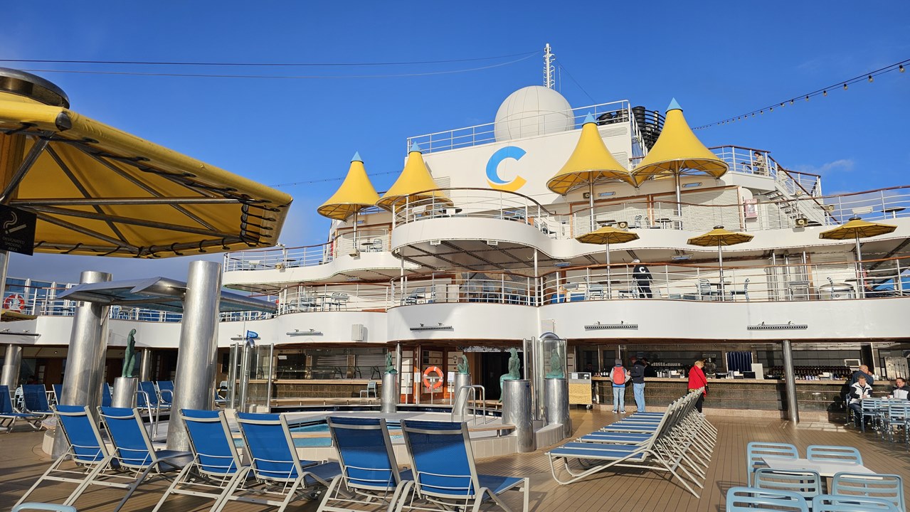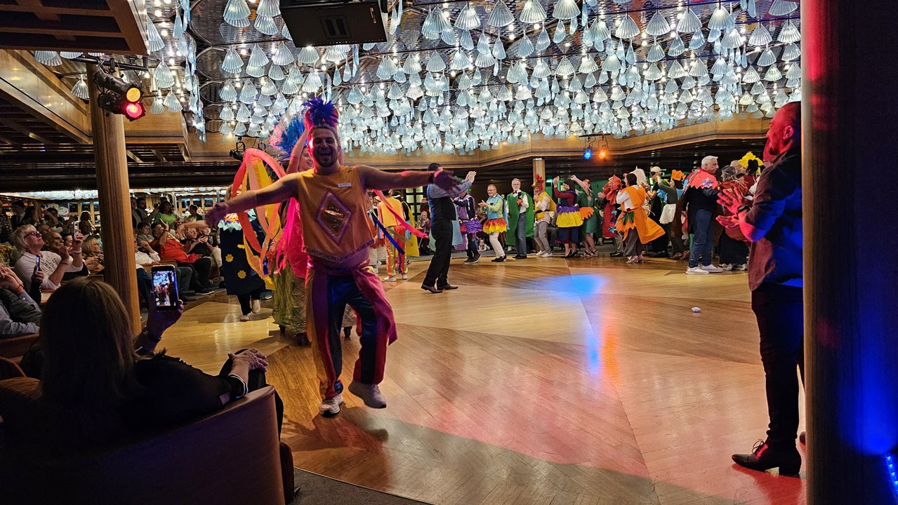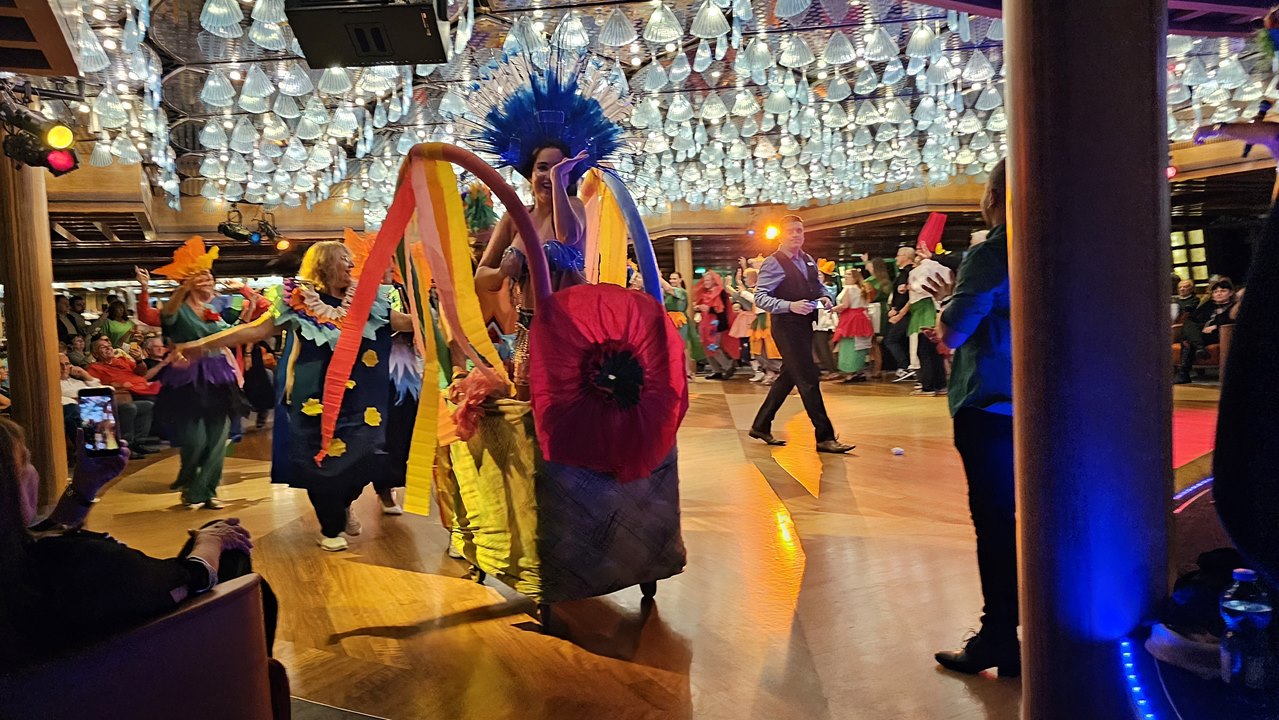 Wir finden mit Mühe einen Tisch und bestellen einen Cocktail. Es ist jetzt 22:45 Uhr. Wir wundern uns über verkleidete Menschen mit bunten Hüten – Gäste wie Costa-Mitarbeiter – die herumstehen und auf irgendwas zu warten scheinen. Und dann geht plötzlich ein Ruck durch die Menge und die verkleideten Menschen formieren sich zu einem Karnevalsumzug! Ja, richtig gelesen – ein Karnevalsumzug! Der Umzug zieht mit viel Getöse durch die ganze Bar, die Menschen feiern und singen mit. Wir auch! Wir fühlen uns absolut gut entertaint 🙂 Wie schon gesagt: Costa versteht sich auf Entertainment!