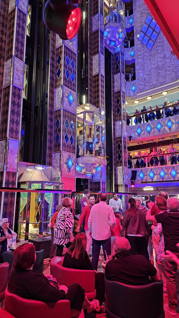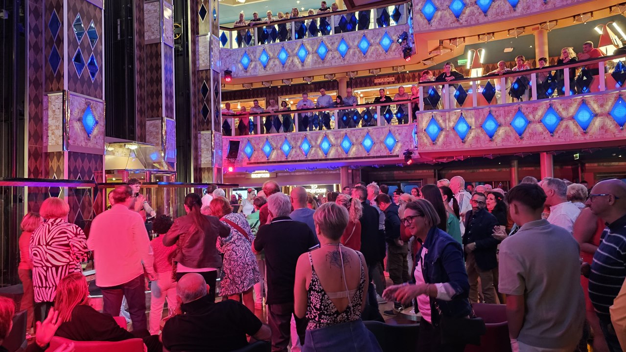 Und was macht man nach dem Theater? Na klar, es geht in die Bar. Wir entscheiden uns für die Grand Palatino Bar auf Deck 5, das ist die größte Bar an Bord – sozusagen die „Hauptbar“. Es ist brechend voll, die Menschen feiern hier einfach weiter. Die Stimmung an Bord ist abends wirklich super und da ist der heutige Abend keine Ausnahme.