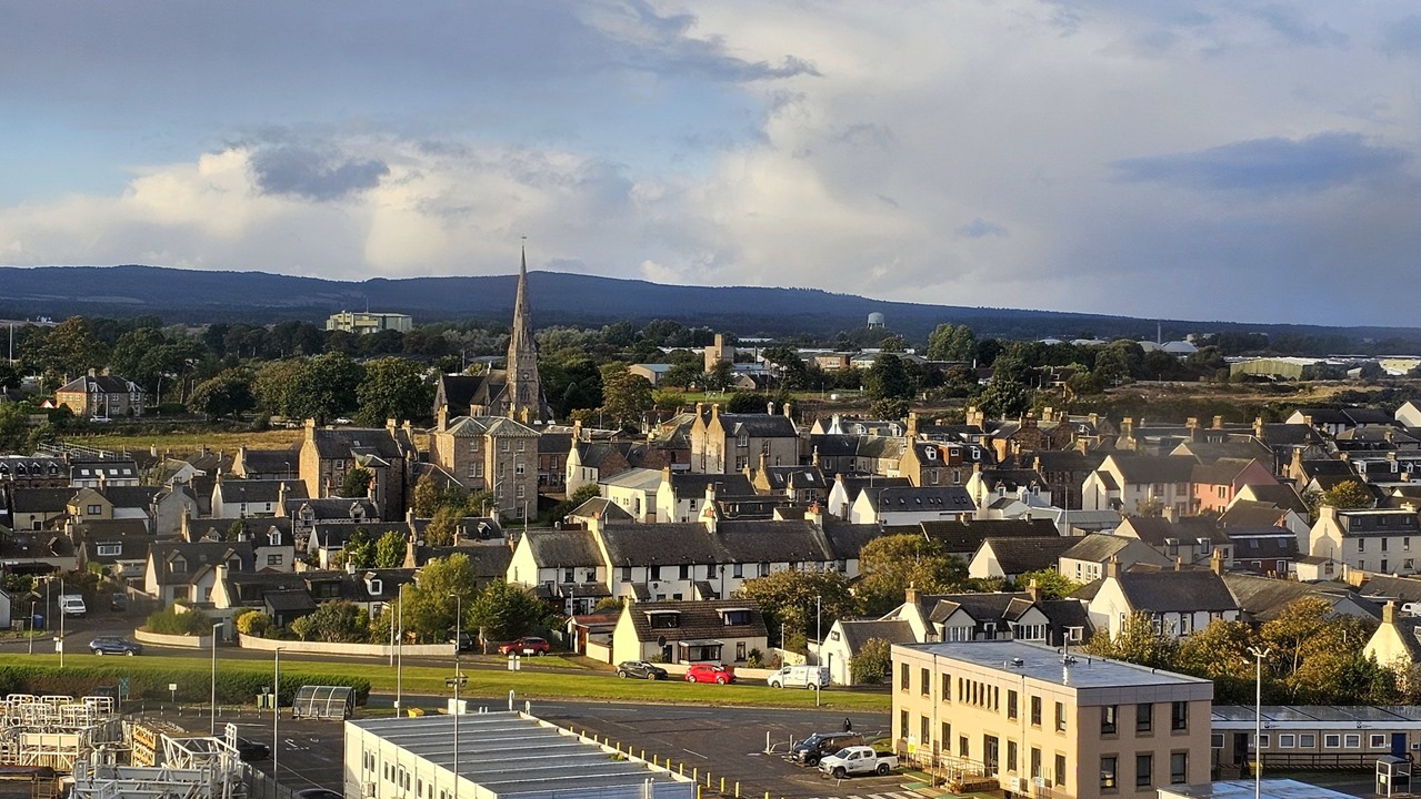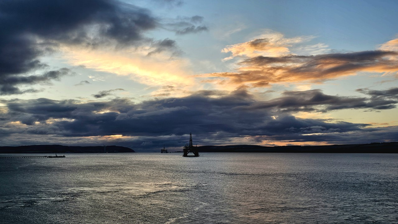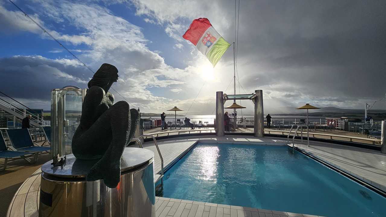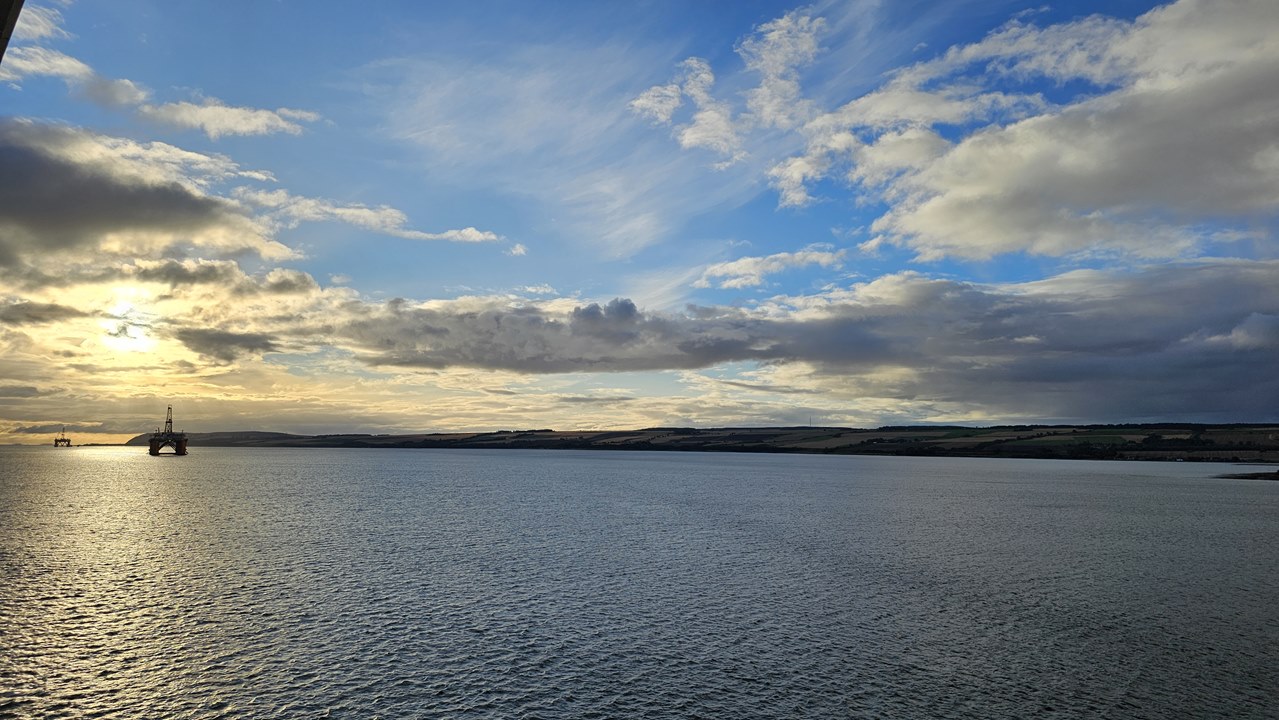 Guten Morgen aus Invergordon. Schon früh um 6 Uhr klingelt der Wecker. Wir wollen die Einfahrt miterleben. Deshalb machen wir uns schnell fertig und erhaschen die ersten Eindrücke von unserem Balkon aus. Dann genehmigen wir uns um 7 Uhr ein kurzes Frühstück, anschließend geht’s hoch aufs Pooldeck. Langsam gleiten wir auf dem Cromarty Firth entlang, einem Meeresarm des Moray Firth. Am Horizont geht die Sonne auf und zaubert alles in ein goldenes Licht.
