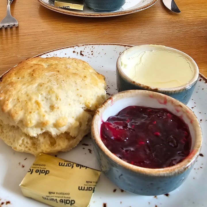 Ganz traditionell bestreichen wir ein Stück Scone mit der Clotted Cream und mit Marmelade. Oh Mann, ist das lecker! Schottischer Himmel 🙂