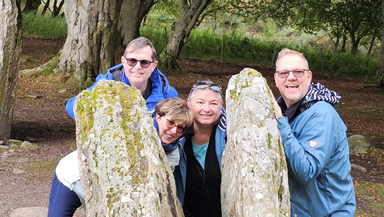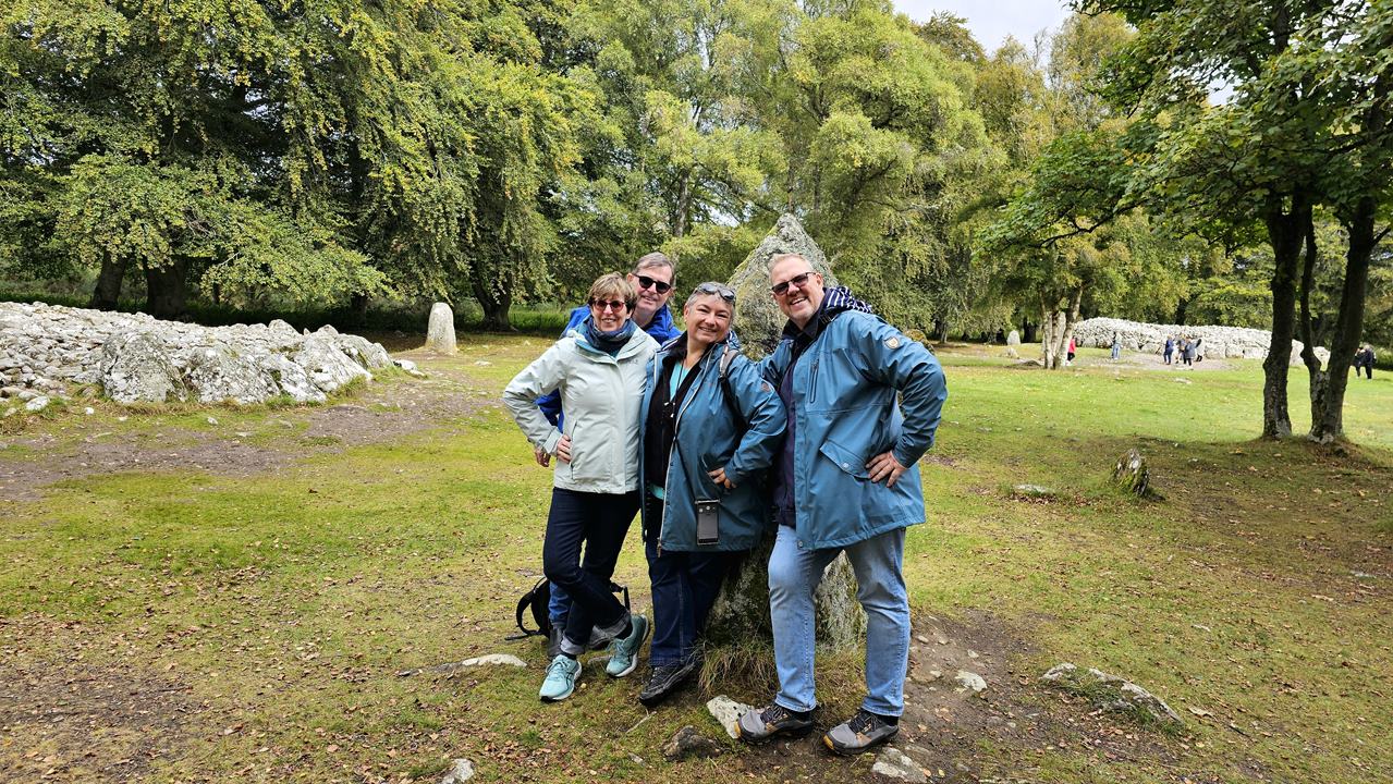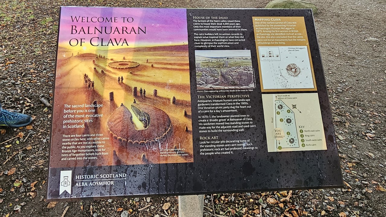 Etwa 5 Minuten Fahrt vom Culloden Schlachtfeld entfernt erreichen wir die Clava Cairns, 4.000 Jahre alte Hügelgräber aus der Bronzezeit. Die prähistorischen Grabhügel sind eine äußerst bedeutende und außergewöhnlich gut erhaltene prähistorische Stätte der schottischen Highlands. Der Weg dorthin ist etwas abenteuerlich, der Parkplatz unbefestigt. Bietet aber genug Platz für unsere Tourbusse. Die historische Stätte ist kaum besucht.
