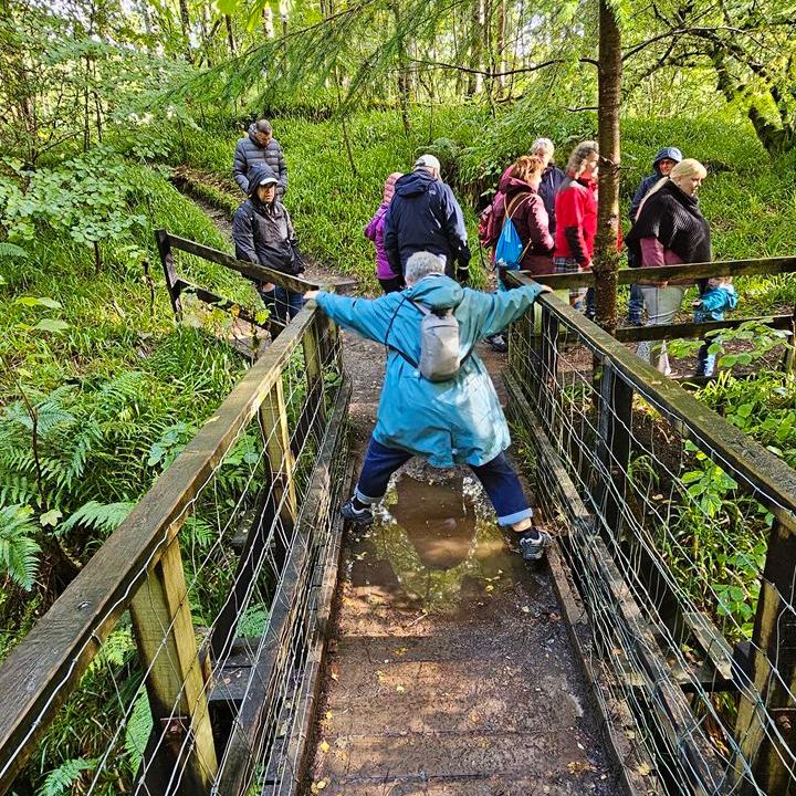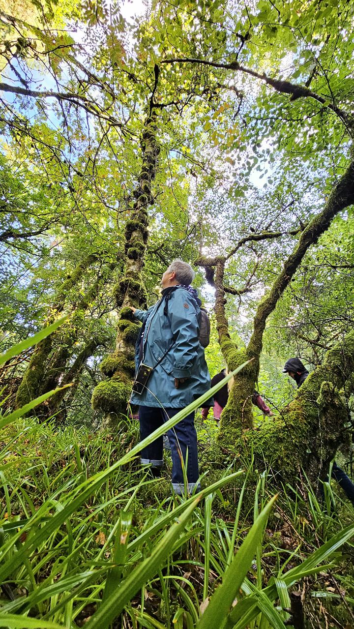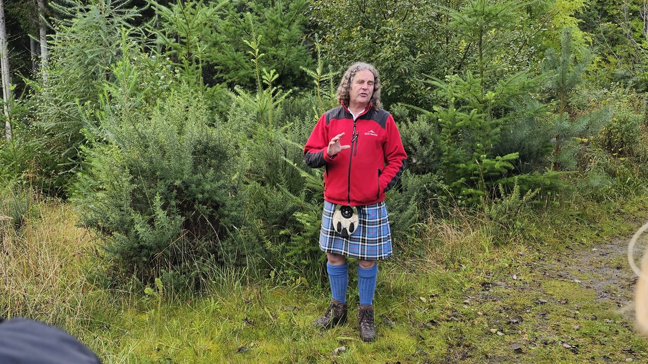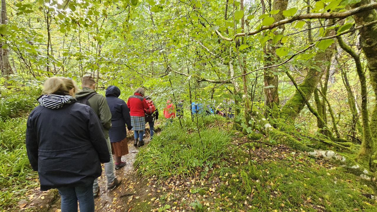 Key führt uns durch den Wald und die herrliche Landschaft. Es ist kühl hier im Wald, gut, dass wir unsere dickeren Regenjacken anhaben. Genau perfekt für das schottische Wetter. Der Boden und die Bäume sind feucht vom Regen, der hier immer wieder mal fällt.