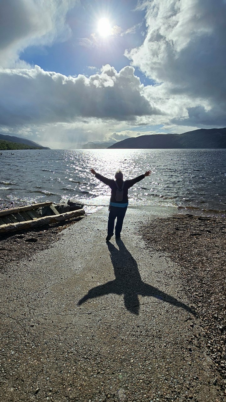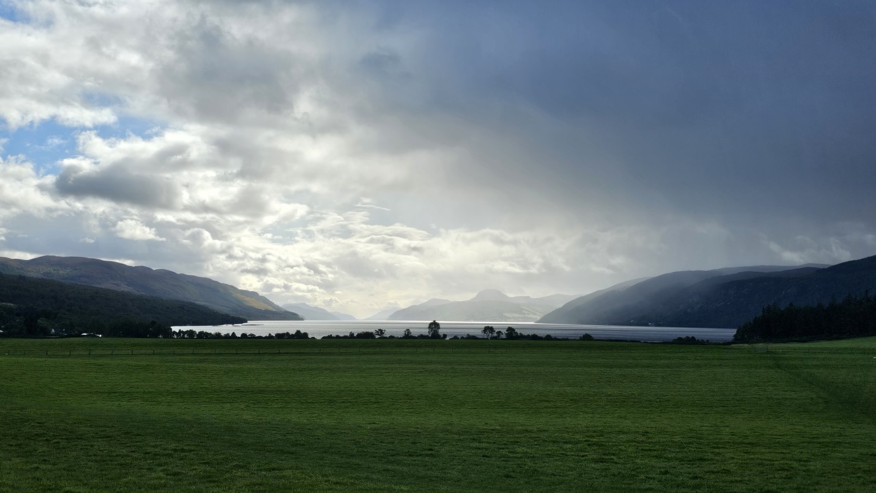 Die Sonne blitzt durch die Wolken und bringt das dunkle Wasser von Loch Ness zum Funkeln. Magisch!