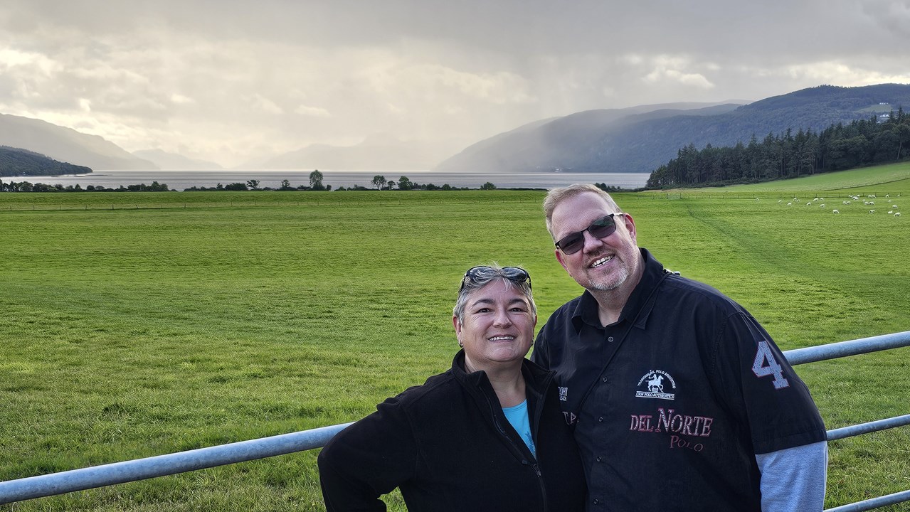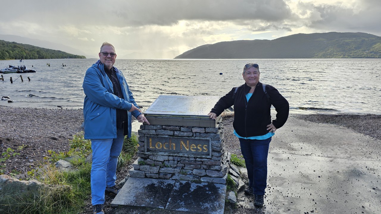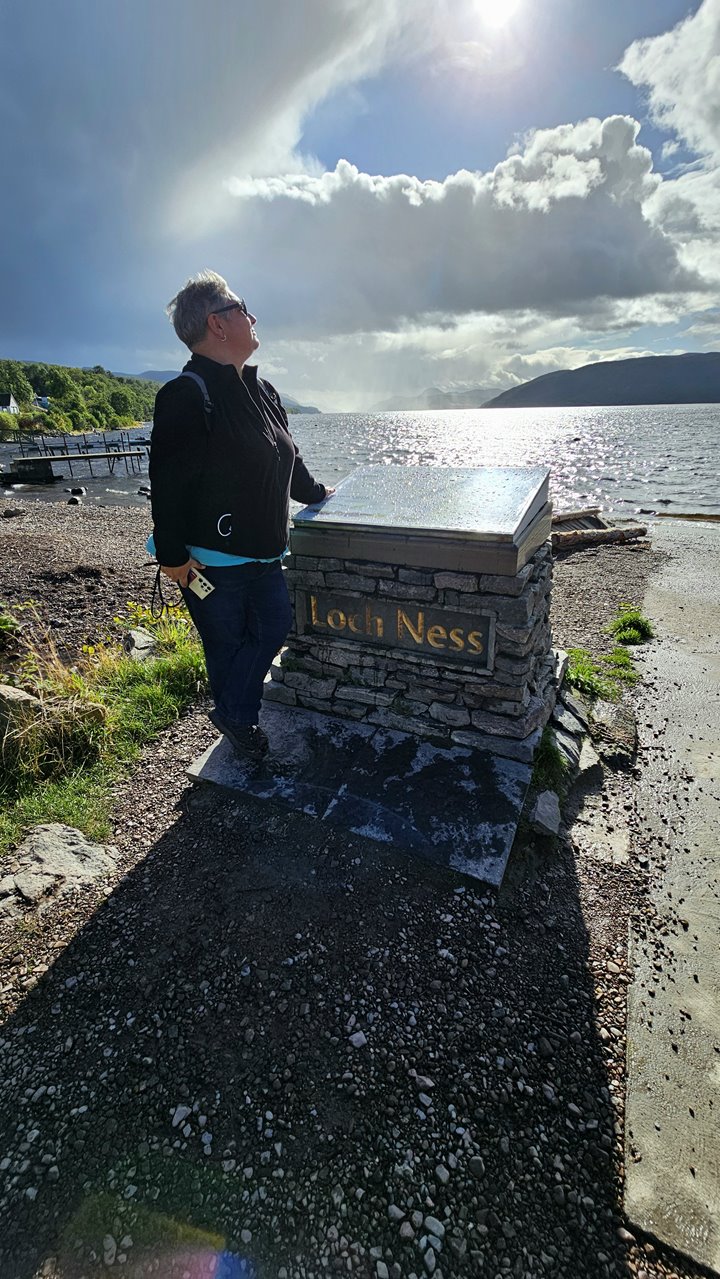 An der Südseite halten wir für einen kurzen Fotostopp und werfen einen ersten Blick auf Loch Ness. Im Hintergrund schimmert das dunkle Wasser des Lochs, eingebettet in die herrlich grüne Landschaft der schottischen Highlands.