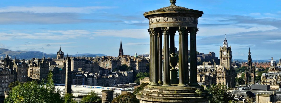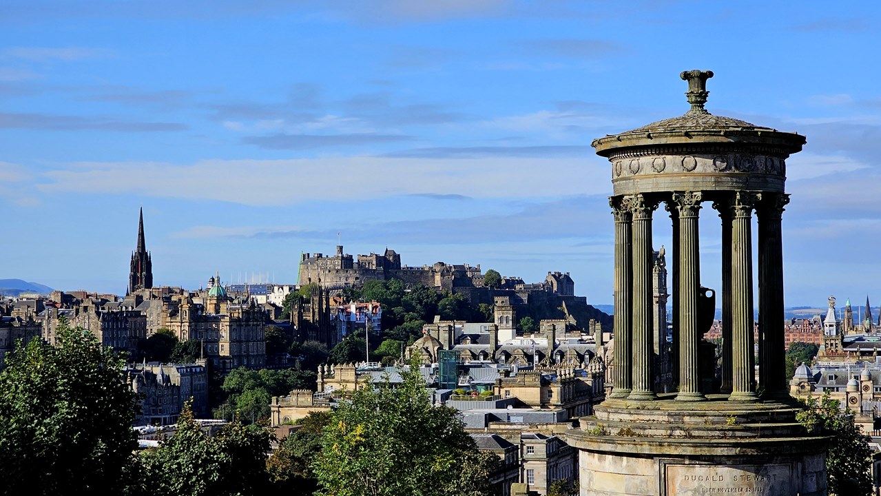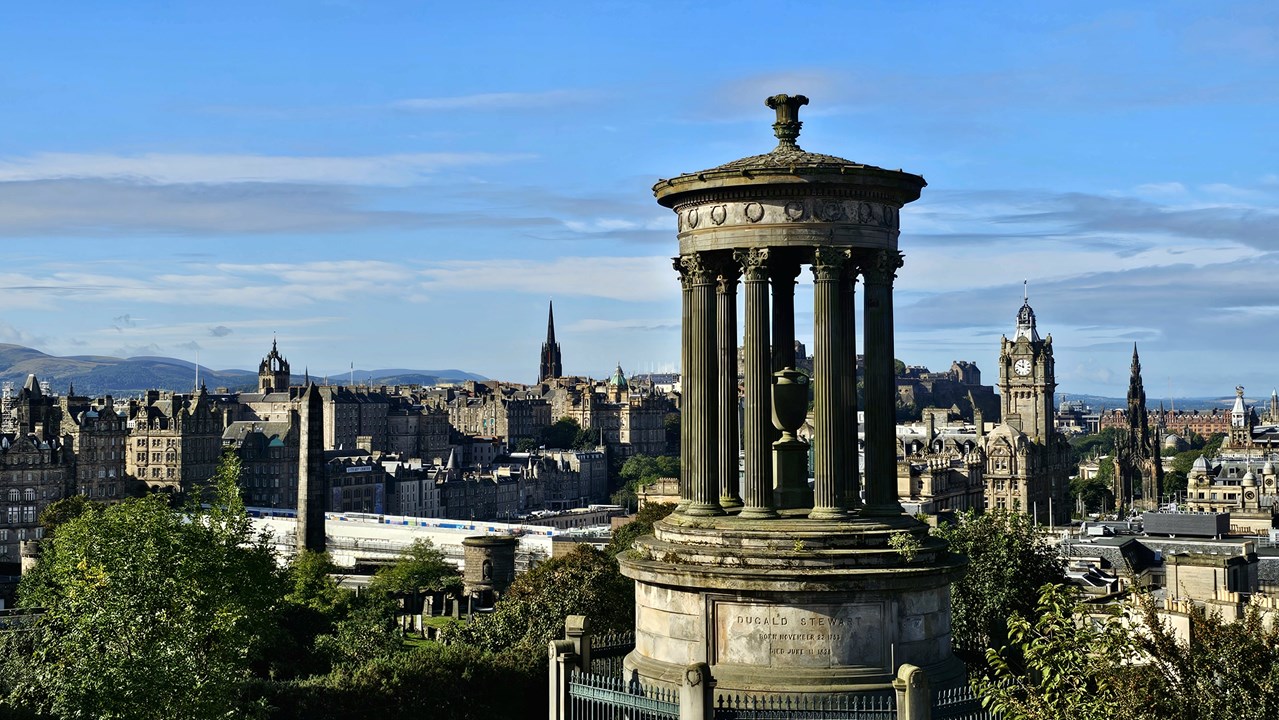 Einem schottischen Philosophen gewidmet, überblickt das Dugald Stewart Monument Edinburgh und dient so als Vordergrund für Aufnahmen der Stadt im Hintergrund.