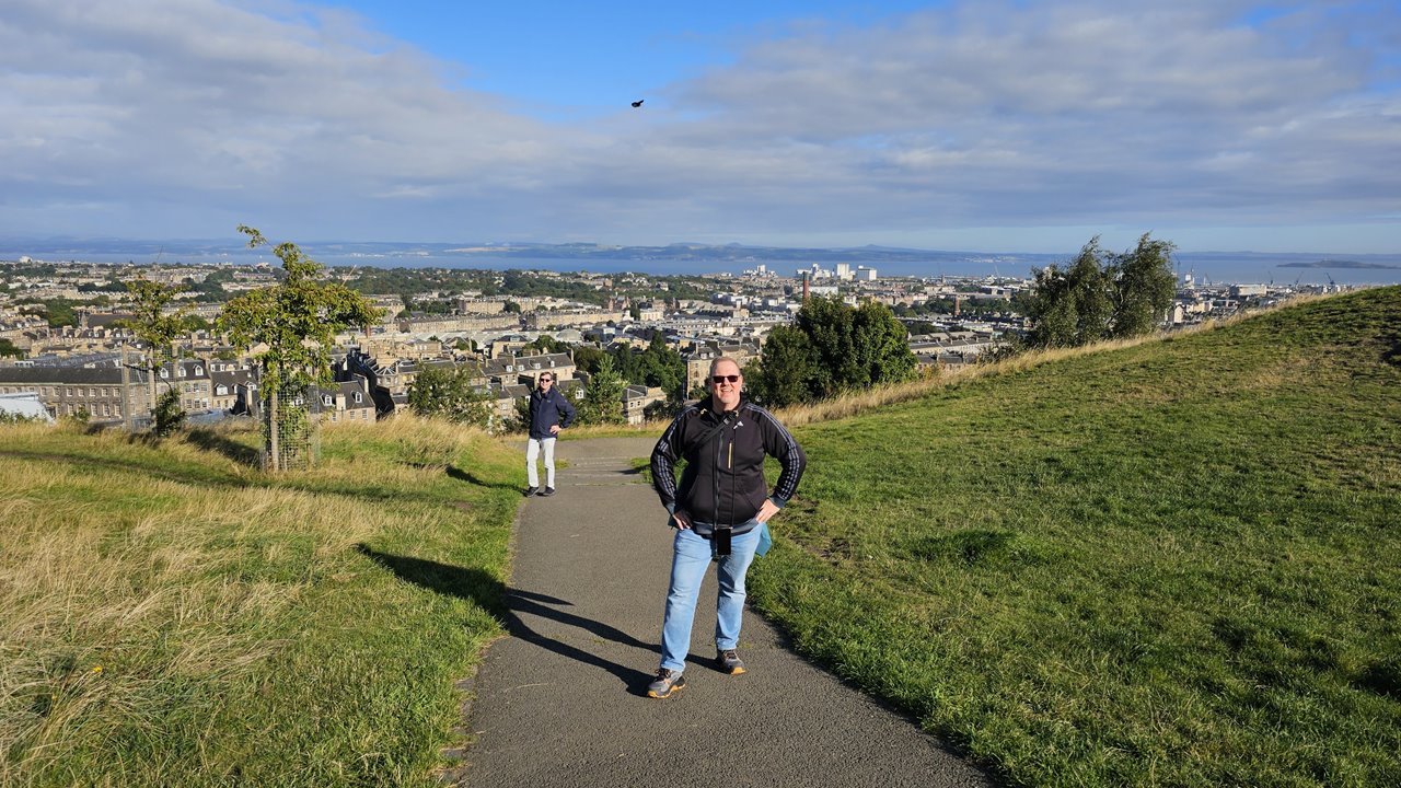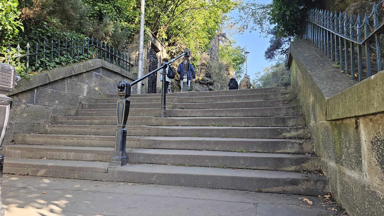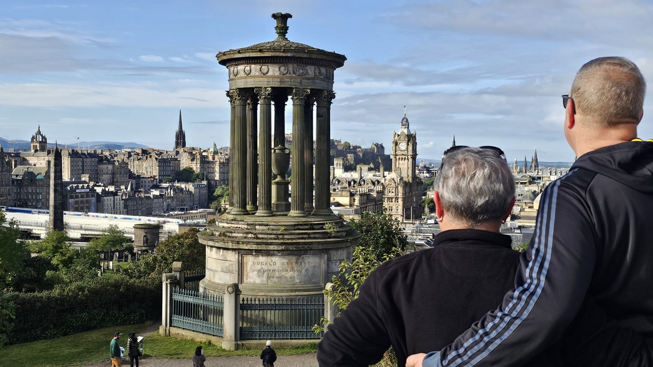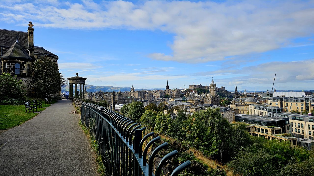 Einen kurzen Fußmarsch weiter, direkt hinter der Altstadt von Edinburgh, erreichen wir den Calton Hill. Edinburgh steht wie das alte Rom auf sieben Hügeln, einer dieser Hügel ist der Calton Hill. Wir erklimmen den knapp 100 Meter hohen Hügel über Treppen und Wanderwege. Der Aufstieg dauert nicht lange und ist einfach zu bewältigen. Schon nach wenigen Minuten sind wir oben.