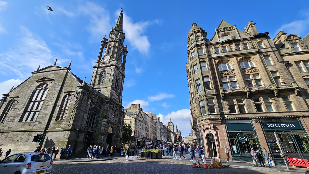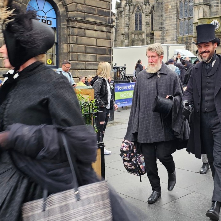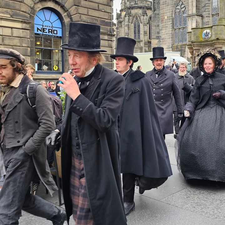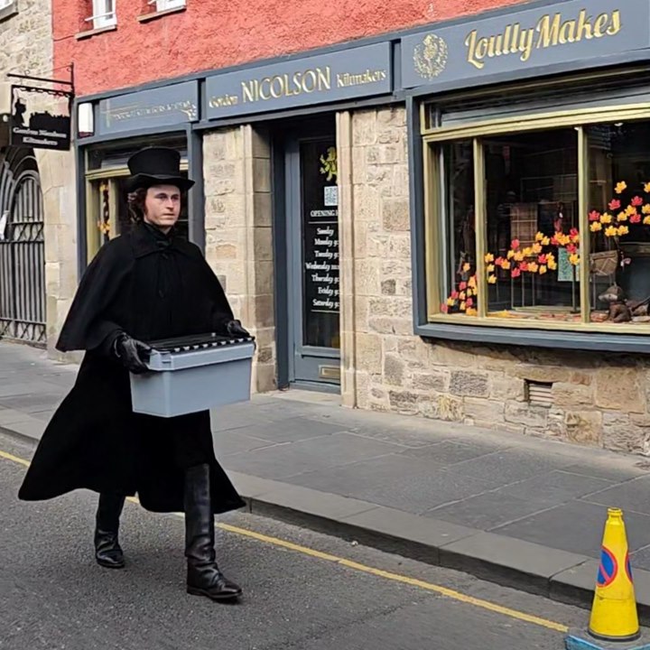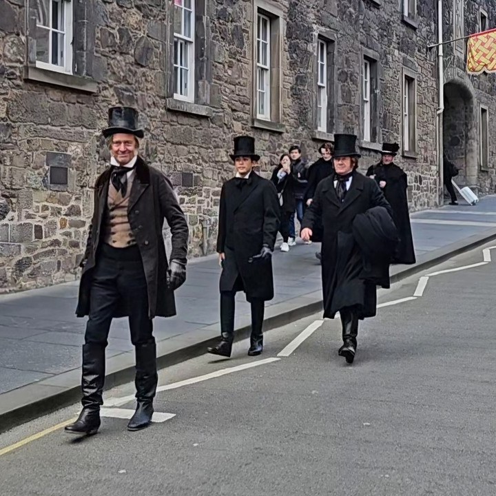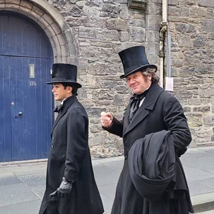 Aber was ist das? Mitten auf der Royal Mile marschieren plötzlich Menschen mit Kleidern aus dem 18. Jahrhundert und Zylinder! Wir erfahren: Guillermo del Toro dreht in diesen Tagen „Frankenstein“ in Edinburgh! Der Film soll 2025 auf Netflix erscheinen. Und dafür haben Filmteams diesen Teil der Royal Mile in die Vergangenheit zurückversetzt.