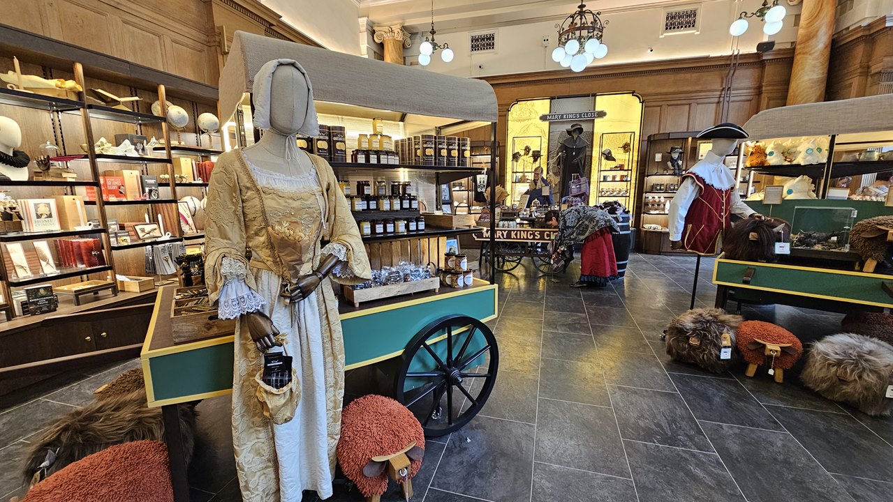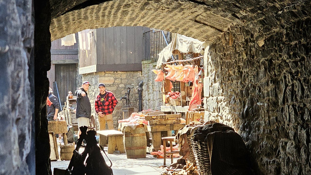 Eine der schönsten Closes ist die Bakehouse Close, direkt neben dem Museum of Edinburgh. Diese Close umfasste damals die Quartiere der Bäcker und Schmiede – Hofpersonal von König James VI. und Charles I. Und genau hier wird für den Film gedreht. Sicherheitspersonal bewacht den Eingang, Requisiten wie Kutschen werden auf Anhängern herbeigekarrt. Neugierig recken wir die Hälse und versuchen wie viele andere Zuschauer einen Blick zu erhaschen. Scheinbar ist diese Location bei Filmdrehs beliebt: Auch in „Outlander“ war Bakehouse Close zu sehen. Und zwar war als Carfax Close in der 3. Staffel.