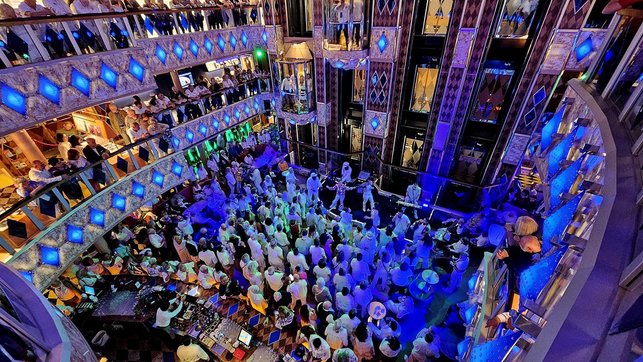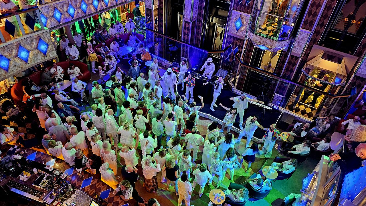 Für heute wurde in der Bordzeitung um 19:45 Uhr in der Diamanti Bar QUEENmania angekündigt. Und hatte vor ein paar Tagen ABBAmania schon so gut gefallen, daher wollen wir unbedingt dorthin. Wie viele andere auch 🙂 Und da heute noch die White Night Silent Party stattfindet, sind bereits jetzt alle ganz in weiß gekleidet. Da sieht bei dem bunten Licht einfach mega aus.