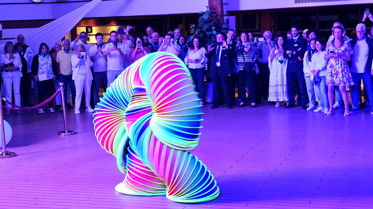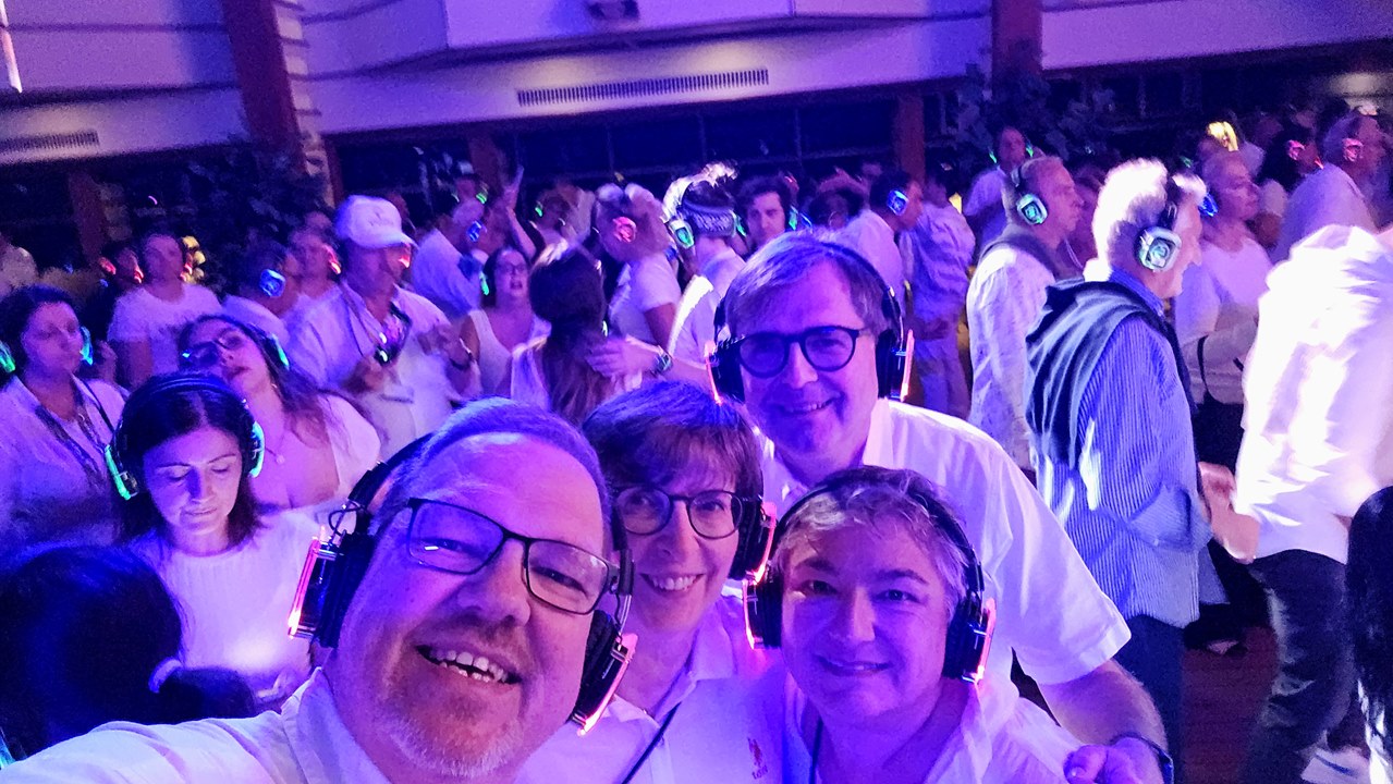Zwischendurch tritt noch das Showensemble auf, auch der Komiker und ein paar Crewmitglieder geben eine Showeinlage zum Besten. Und dann startet die White Night Silent Party! Drei DJs legen in unterschiedlichen Musikstilen auf: Latin Pop, Commercial und Revival Vibes. Zu hören sind diese nur auf den Kopfhörern, die man sich vorher gegen eine Ausleihgebühr ausleihen kann (über Bordkarte). Diese bekommt man natürlich zurück, sobald man die Kopfhörer wieder abgibt 🙂 Wir setzen unsere Kopfhörer auf und können zwischen den drei „Sendern“ hin und her switchen, ganz nach Laune 🙂