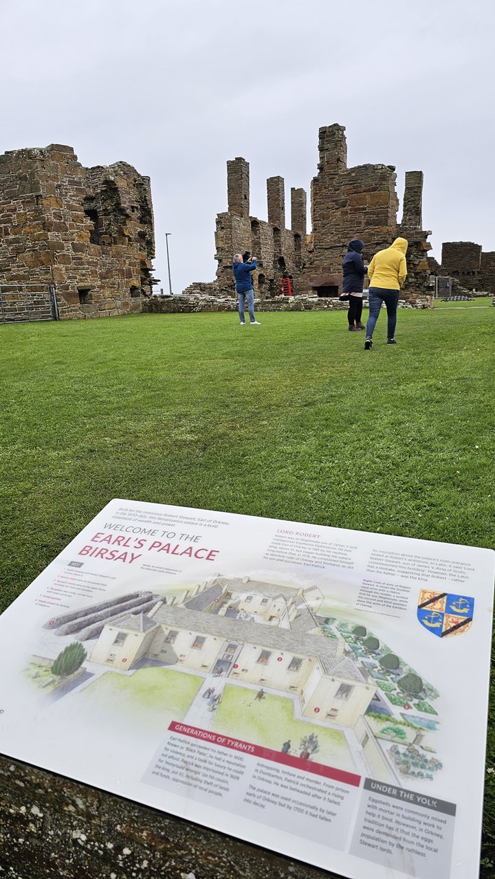 Inzwischen regnet es wieder stetig. Daher halten wir nur kurz am wenige Minuten entfernten Earl’s Palace. Der Earl’s Palace in Birsay ist eine beeindruckende Ruine aus dem 16. Jahrhundert und war einst das prachtvolle Zuhause eines der einflussreichsten Clanführer der Orkneys. Der Palast wurde von Patrick Stewart, dem Earl of Orkney, zwischen 1600 und 1607 erbaut und diente als Symbol seiner Macht und seines Reichtums. Patrick Stewart war ein kontroverser Herrscher, dessen autoritäre Herrschaft und Konflikte mit der Krone letztlich zu seinem Sturz führten. Nach dem Fall von Patrick Stewart und der Übernahme durch die Krone wurde der Palast vernachlässigt und verfiel im Laufe der Zeit.
