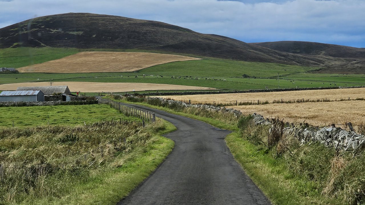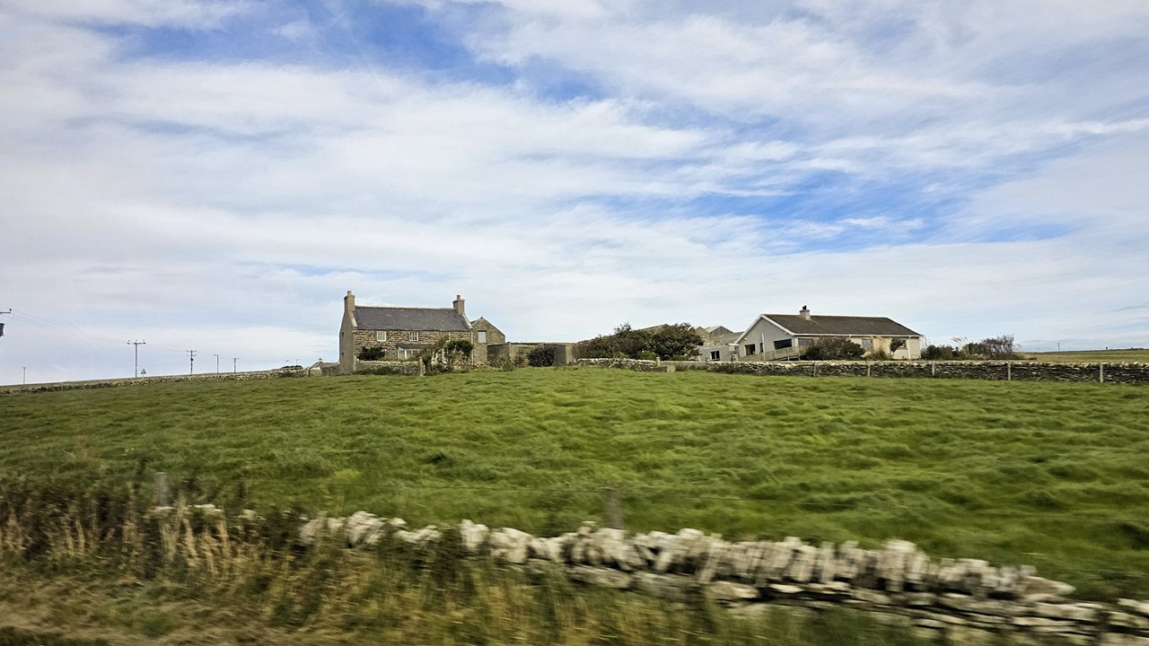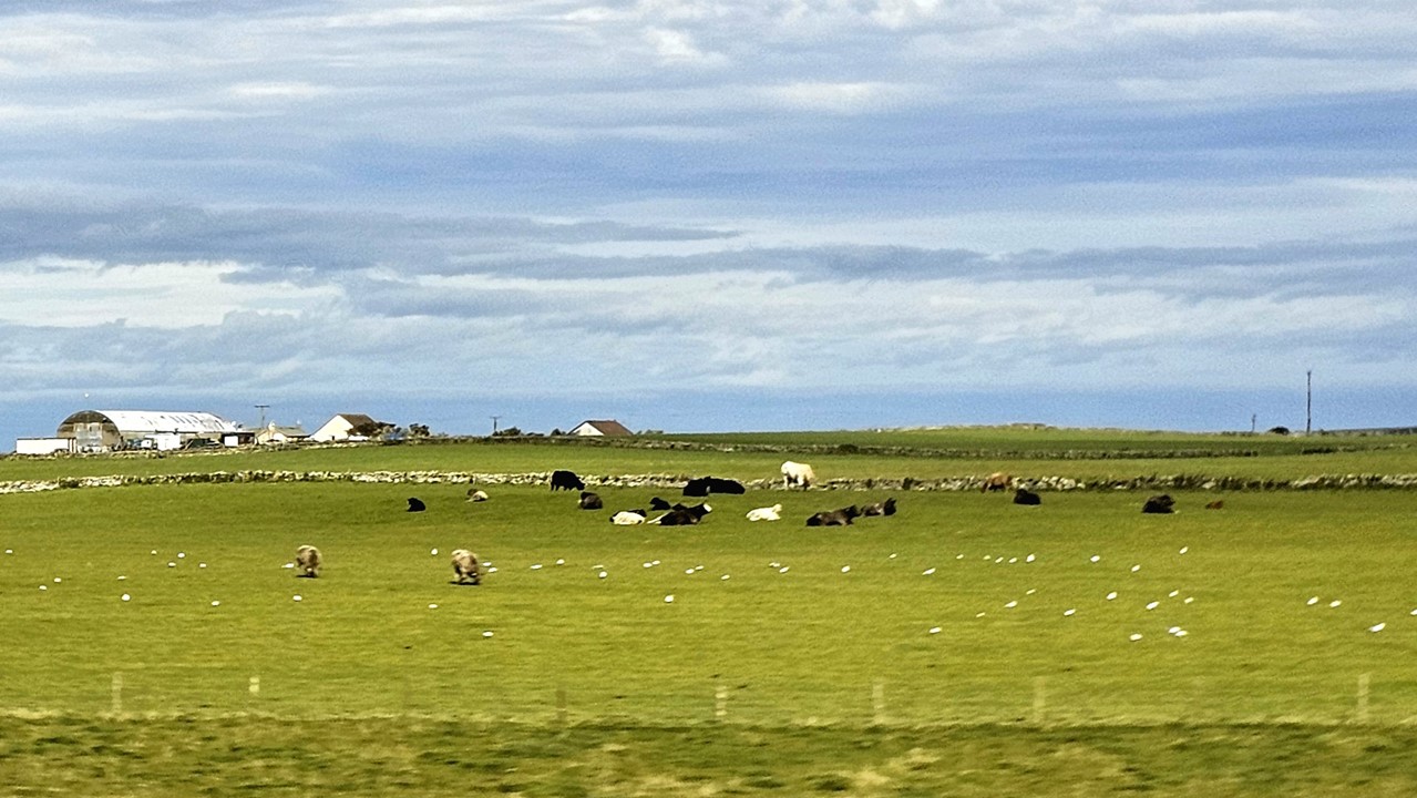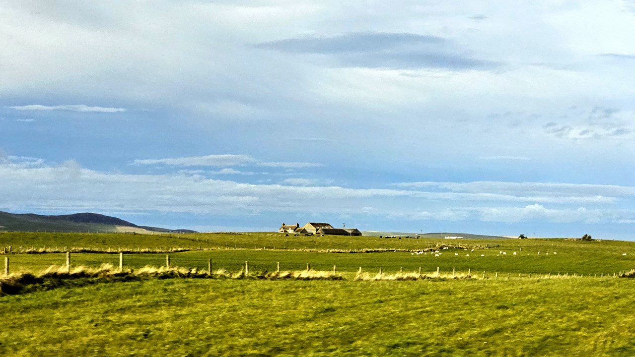Unsere Tour führt uns über die grüne Landschaft der Orkneys. Die raue, aber beeindruckende Landschaft wird geprägt von sanften Hügeln, Mooren und weiten Grasflächen. Überall grasen entspannte Kühe und Schafe. Man kann weit über das flache Land blicken, vereinzelt steht mal mittendrin ein Bauernhof oder ein Haus.