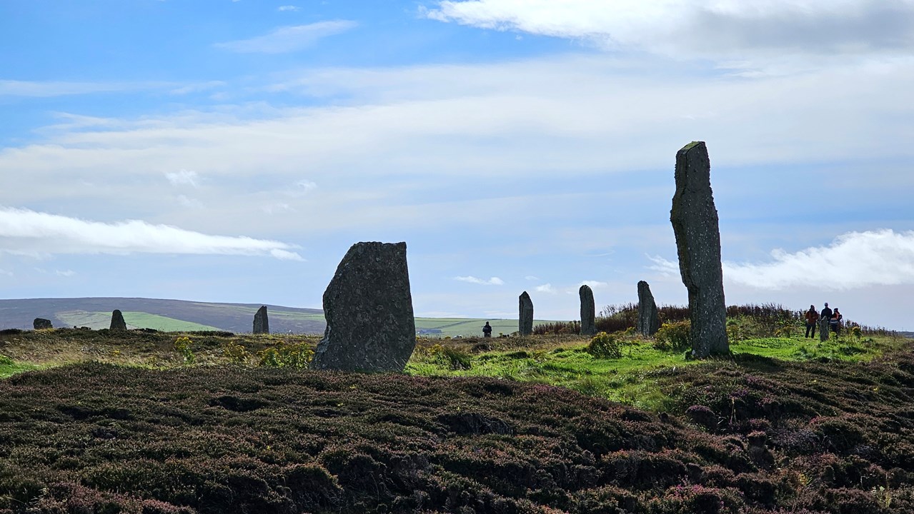 Key führt uns in einem kurzen Spaziergang rund um den gesamten Steinkreis. Dazu laufen wir auf einem vorgegebenem Rundweg, der Steinkreis selbst darf nicht betreten werden. Überall blüht wunderschönes Heidekraut, der Steinkreis liegt inmitten herrlicher Natur.