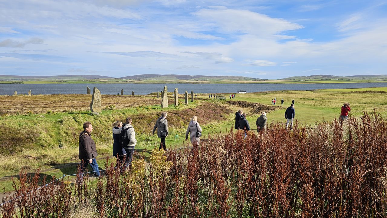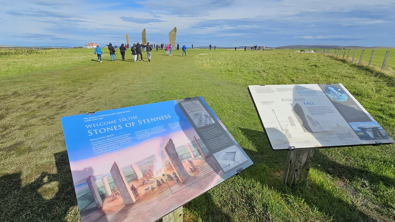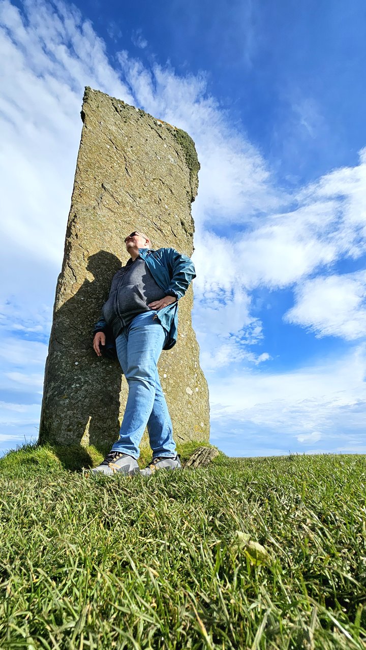 Key führt uns in einem gemächlichen Spaziergang rund um den gesamten Steinkreis. Und erzählt anschaulich Geschichten und Legenden rund um Schottland, Orkney und die Steinkreise.