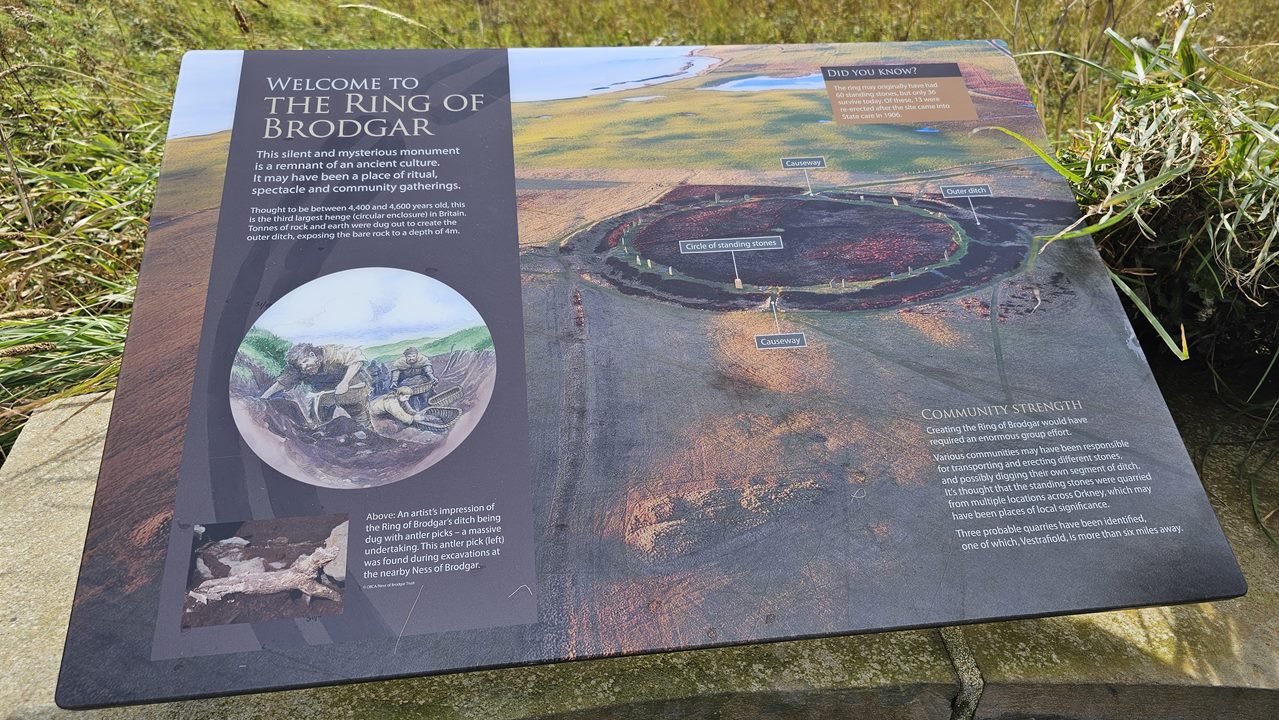 Der Ring of Brodgar ist der drittgrößte Steinkreis Großbritanniens und sicher einer der prachtvollsten in ganz Schottland. Einst bestand er aus 60 bis zu 4,5 Meter hohen Monolithen, die in einem Kreis von 104 Metern Durchmesser standen. Heute stehen davon noch 27 Steine. Er ist älter als Stonehenge und die großen Pyramiden Ägyptens, aber immer noch rund 300 Jahre jünger als die nahegelegenen Stones of Stenness.