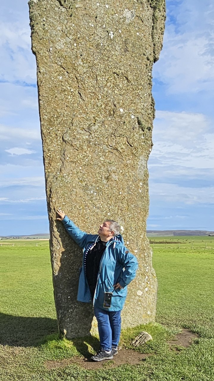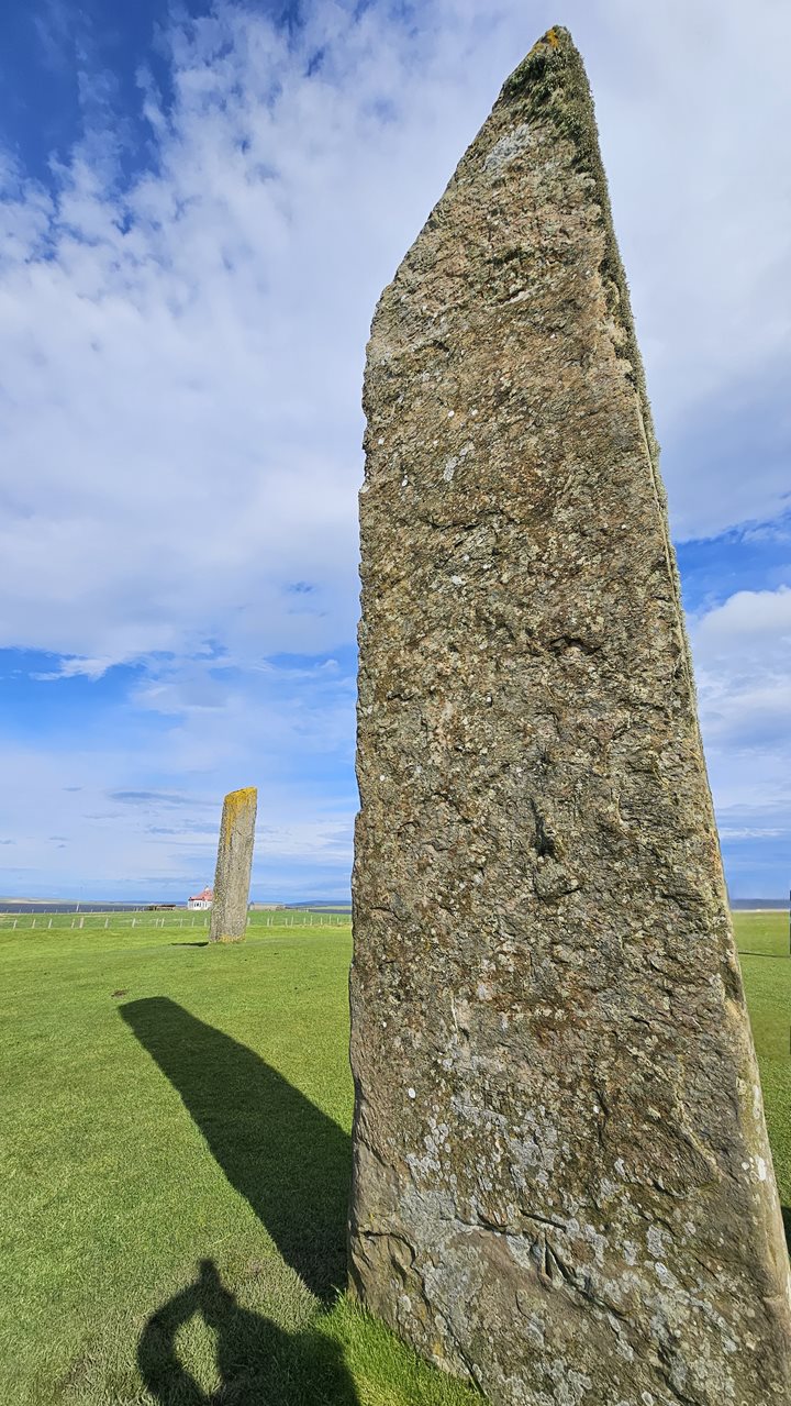 Nach einer kurzen Fahrt erreichen wir unseren ersten Stopp: der Steinkreis Stones of Stenness. Key parkt auf einem kleinen Parkplatz und führt uns zu den riesigen Monolithen, die weit über das flache Land von Orkney sichtbar sind. Drei hohe Steinriesen ragen bis zu sechs Meter in den Himmel. Und das mitten in einem weiten, grünen Feld mit Schafen nebenan 🙂