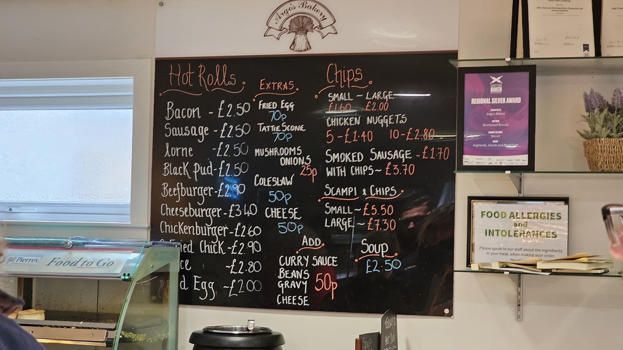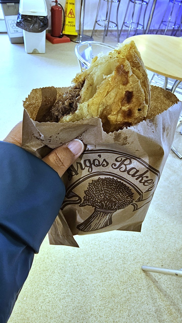 So langsam schlägt das Wetter um. Es wird grauer, Regen liegt in der Luft. Da kommt uns die Pause gerade recht. Key fährt uns zu Argos-Bäckerei etwas außerhalb und empfiehlt eine typische Orkney-Spezialität: Warme Teigtaschen mit Füllung, sogenannte Hot Rolls. Wir nehmen eine mit Rindfleisch gefüllt. Sehr, sehr lecker!