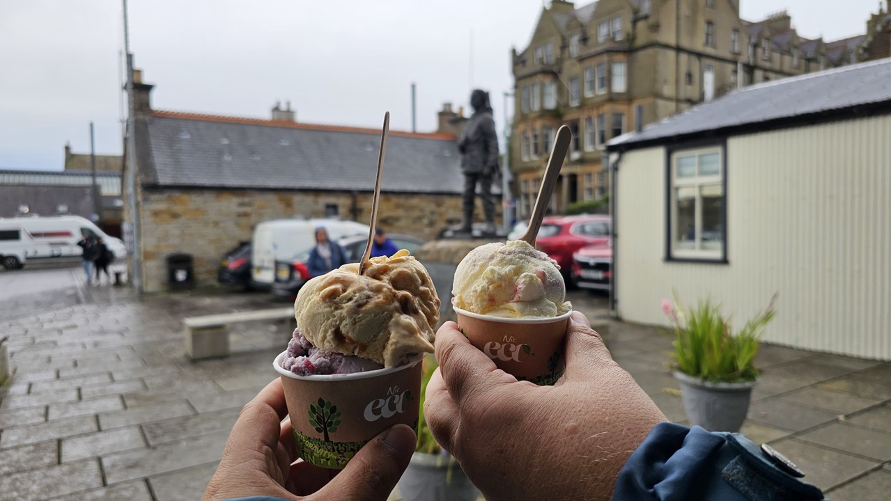 Nach der Stärkung fahren wir wieder in den Ortskern, hier hat uns Key noch Original-Orkney-Eiscreme versprochen. Im Souvenirladen am Marktplatz gibt es einen Verkaufsstand für Orkney-Eiscreme. Hier erstehen wir das versprochene Eis 🙂