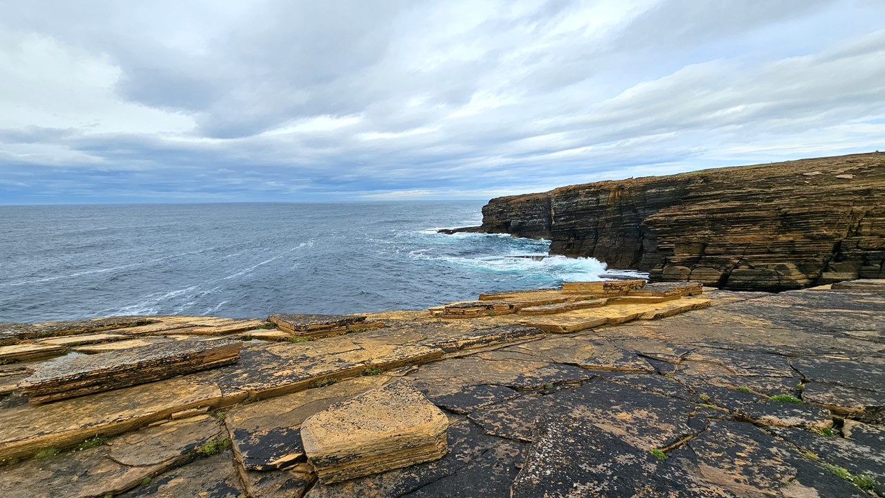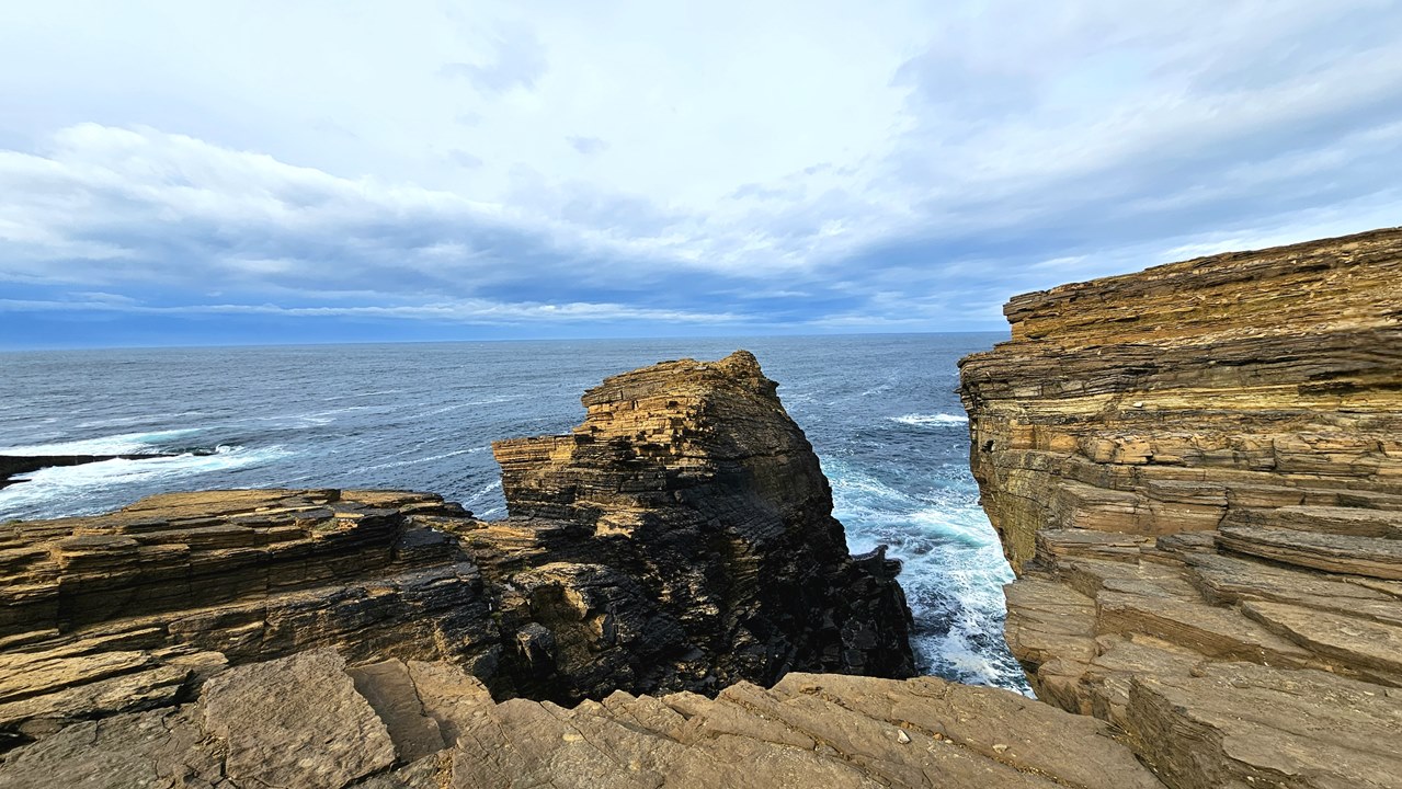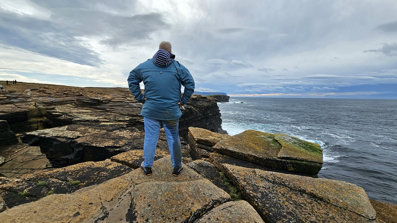 Und dann erleben wir ein fantastisches Naturschauspiel! Key bringt uns zu seinem Lieblingsplatz auf den Orkneys: Die Klippen von Yesnaby. Diese eindrucksvolle Küste befindet sich an der Westküste der Insel Mainland und gehört zu den eindrucksvollsten geologischen Sehenswürdigkeiten der Region.