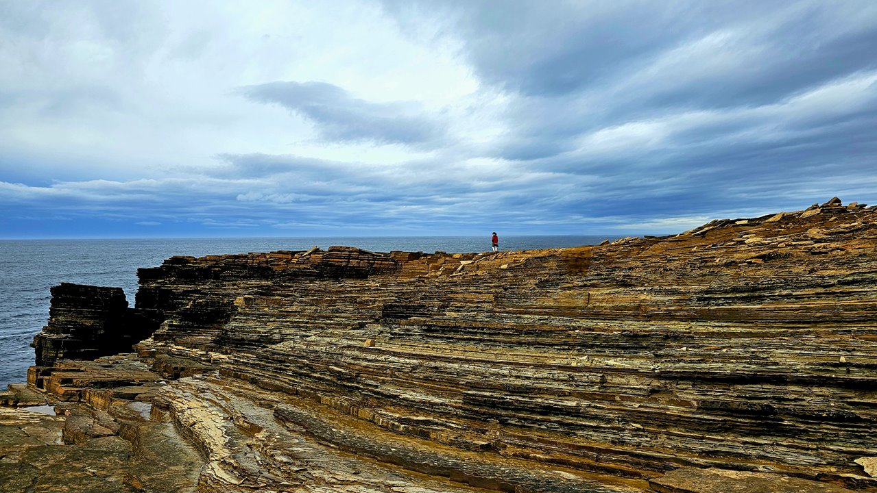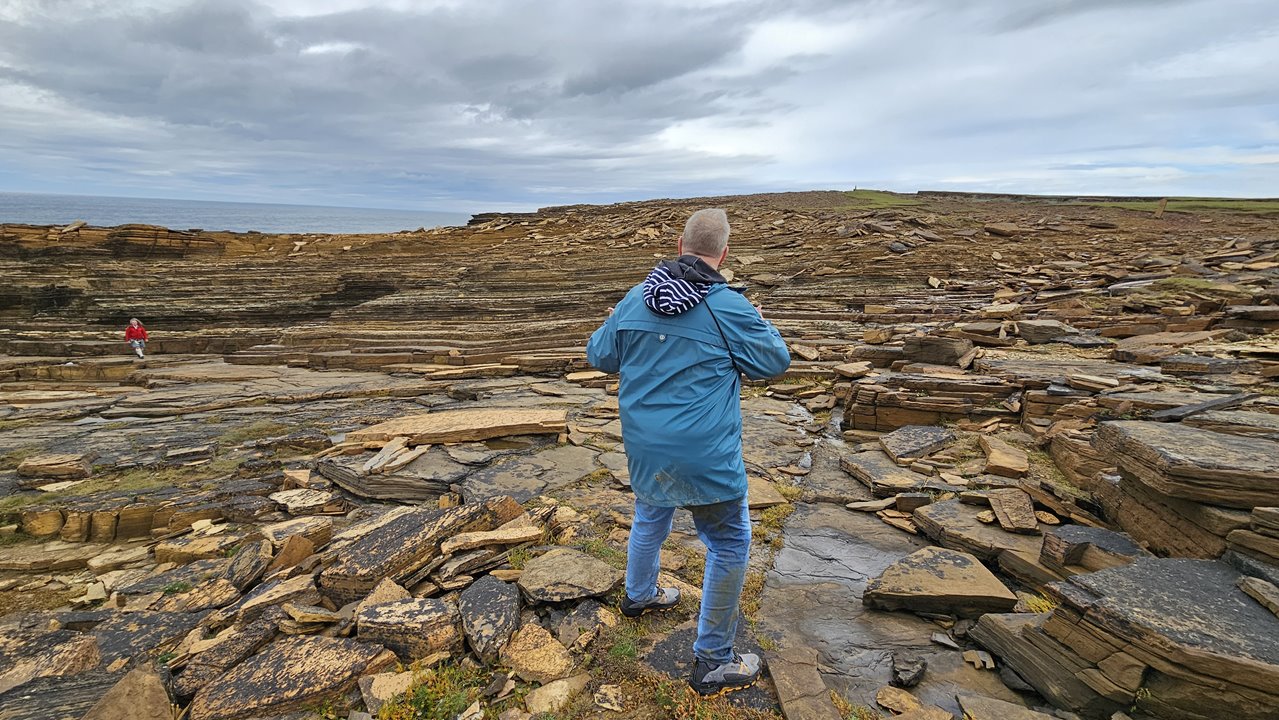 Die Yesnaby-Klippen sind geologisch sehr alt und bestehen hauptsächlich aus Gesteinen, die rund 3 Milliarden Jahre alt sind. Diese Felsen gehören zur Archaikum-Ära, einer der ältesten geologischen Perioden der Erde. Und auf diese Klippen klettern wir jetzt. Echt? Da sollen wir hoch?