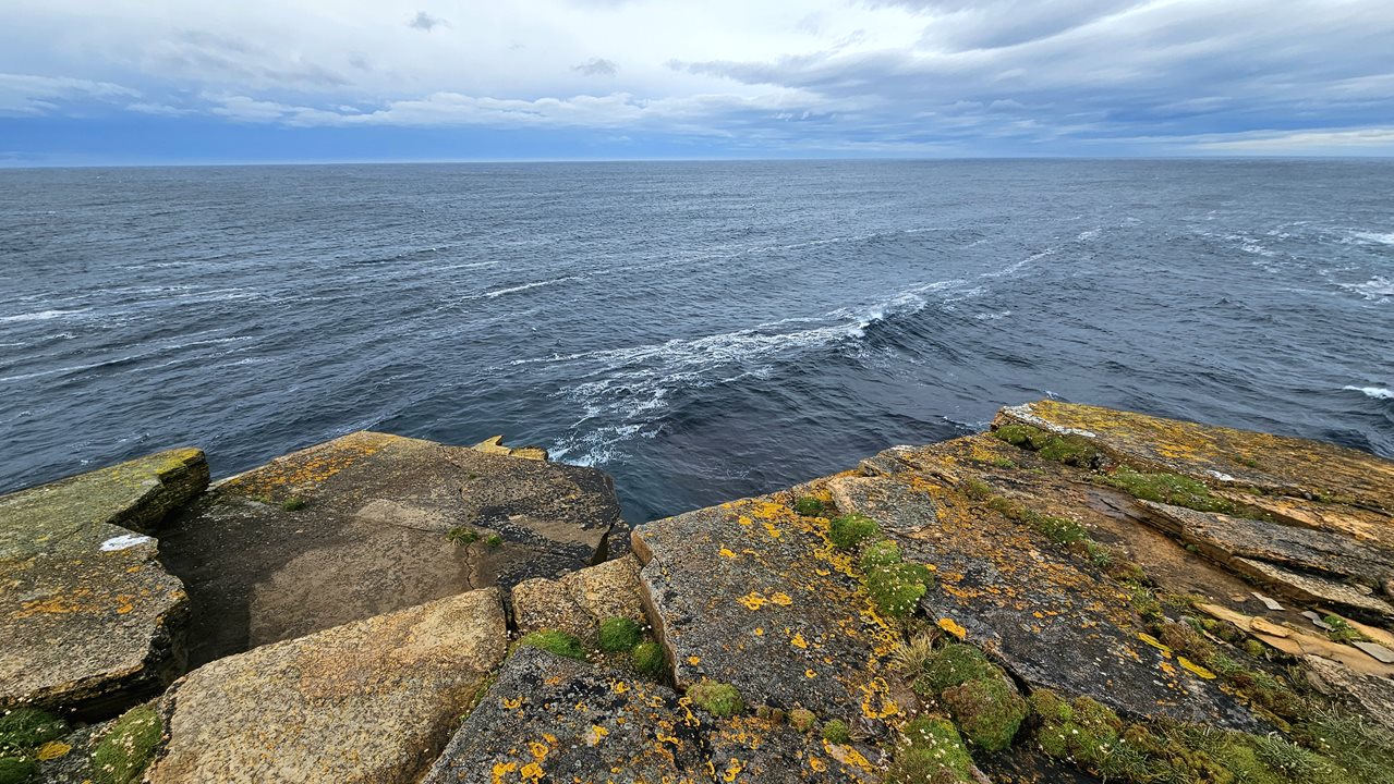 Wir blicken auf das Meer hinaus und schauen auf eines der rauesten Gewässer rund um die Orkneyinseln. Der Wind ist stark, die Wolken hängen tief am Himmel, eine mystische Atmosphäre.