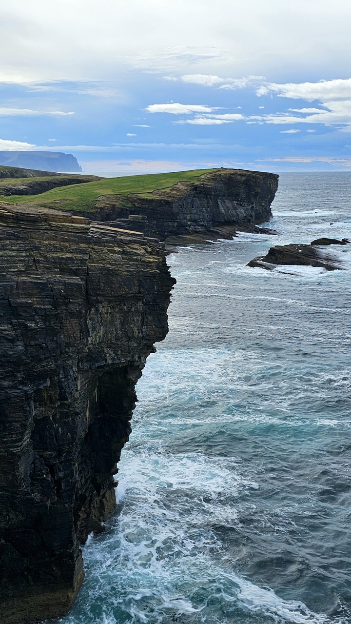 Die Fahrt vom Ring of Brodgar bis hierhin dauerte nur 15 Minuten. Und nun stehen wir auf etwa 30 Meter hohen Klippen und uns bietet sich ein atemberaubender Ausblick auf das raue Meer der Nordsee. Das Meer schlägt laut an die Klippen, Gischt zischt und brodelt zwischen zerklüfteten Felsen, steile Felsen stürzen dramatisch ins Meer. Mehr Natur geht nicht!