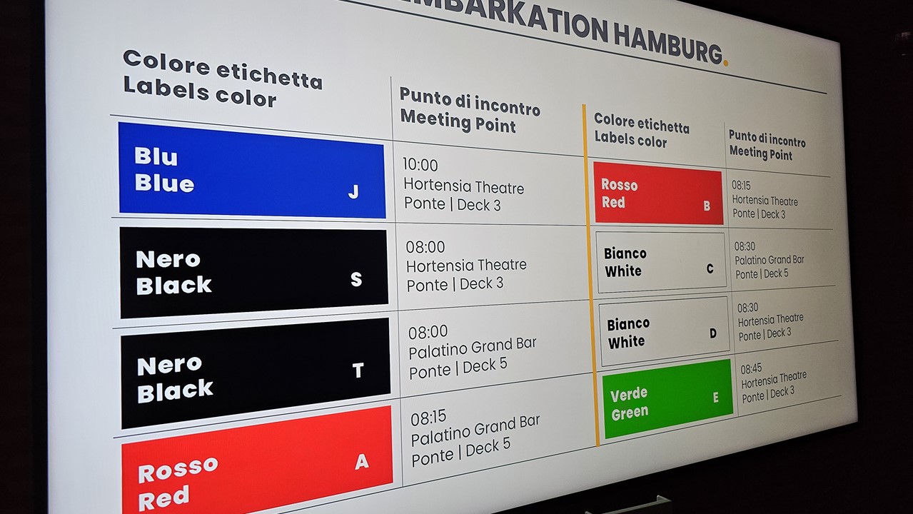 Auf den Bildschirmen in den öffentlichen Bereichen wird die Farbverteilung der Decks angezeigt. Hier werden unsere „Farben“ und Ausschiffungszeiten angezeigt. Nochmal kurz nachschauen, ob wir alles richtig verstanden haben und dann ab auf Kabine. Koffer fertig machen und vor die Tür stellen.