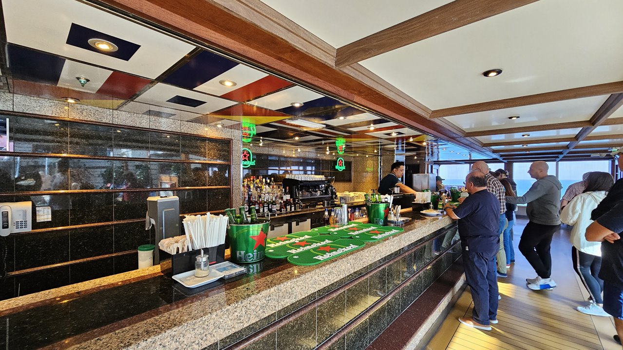 Nach einer Weile haben unsere Freunde Juli und Greg Hunger. Wir zeigen den beiden das Burger-Restaurant, dass wir vor kurzem erst entdeckt haben. Lt. Bordzeitung gibt es hier ab 19 Uhr Burger als „Bezahl-Burger“, jeden Tag unterschiedliche, ein wenig exotische. Was nicht in der Bordzeitung steht: Es gibt über den ganzen Tag hier Burger, halt Standard-Burger wie Cheeseburger oder Chickenburger. Und diese sind inkludiert und müssen nicht extra bezahlt werden 🙂 Steht nirgends, ist aber so 🙂