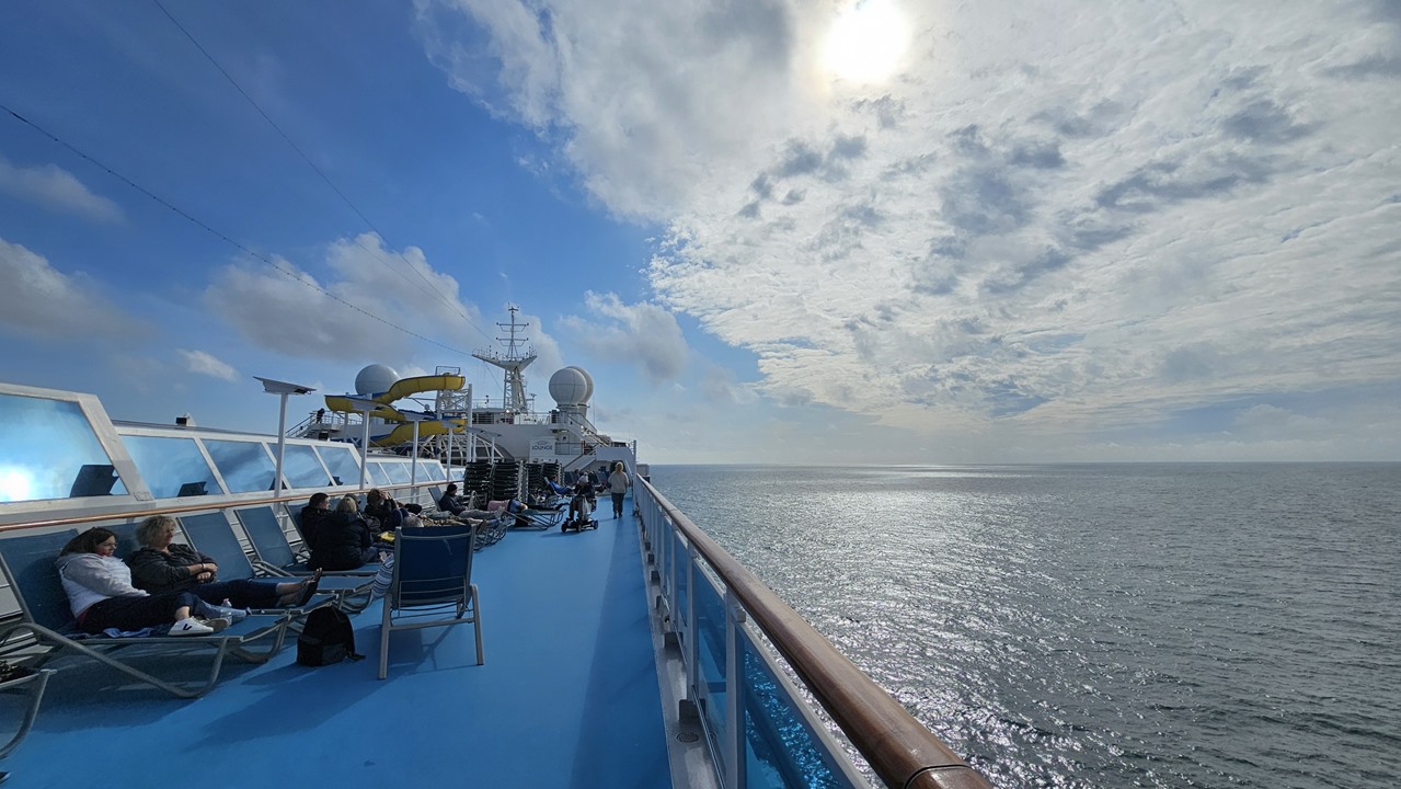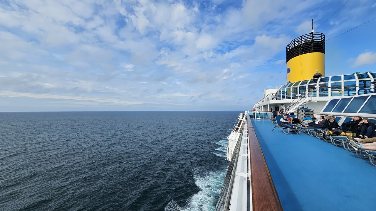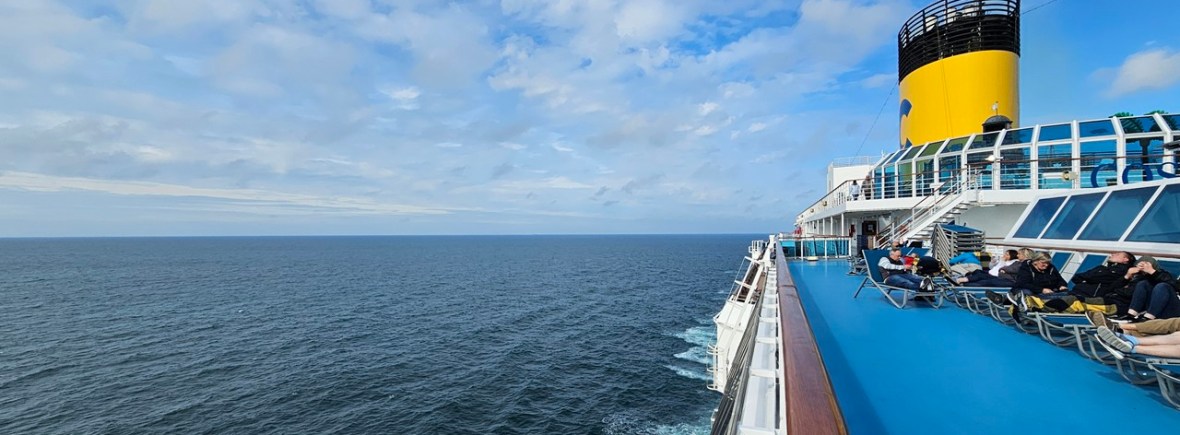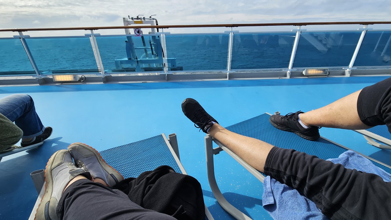 Gesättigt begeben wir uns wieder an unseren schönen sonnigen Liegeplatz auf Deck 11. Und lassen uns die Sonne ins Gesicht scheinen 🙂 Irgendwann wird es sogar so warm, dass wir die Fleecejacke ausziehen und im T-Shirt liegen. Ein perfekter letzter Tag!