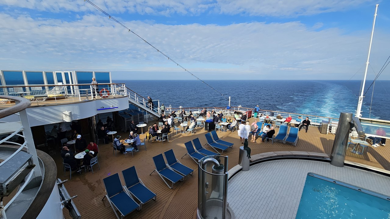 Und nun suchen wir uns einen schönen Liegeplatz auf Deck 11. Das Wetter ist toll, richtig schön sonnig. Perfekt für einen Seetag. Und die Sonne wird uns den ganzen Tag begleiten 🙂