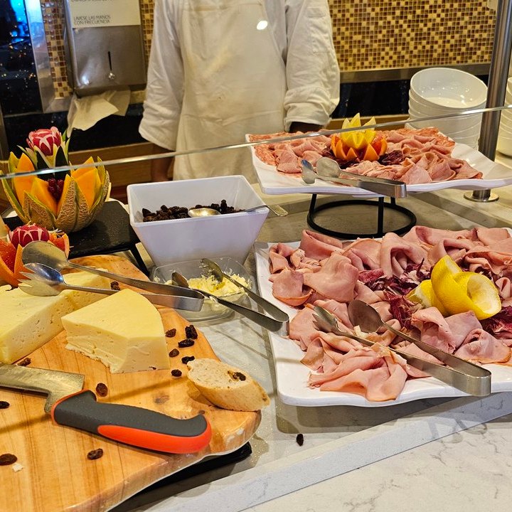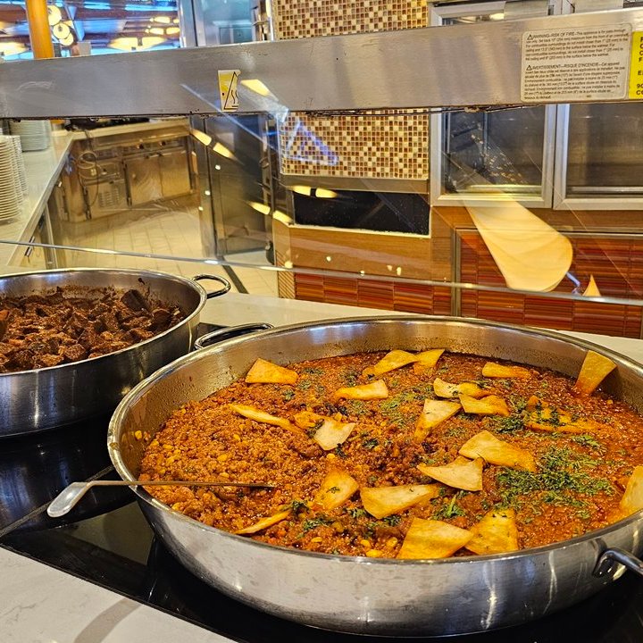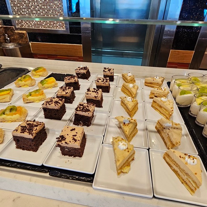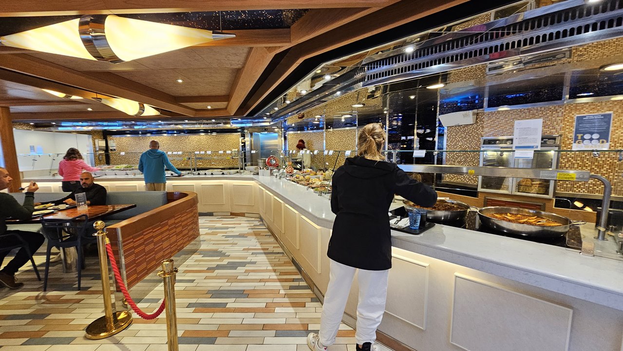 Irgendwann merken wir, dass der Berliner vom schnellen Kaffee nicht mehr ausreicht. Also, ein kleines Mittagessen wäre jetzt schön. Gesagt, getan. Wir fallen wieder im Buffetrestaurant auf Deck 9 ein. Insgesamt hat dieses Buffetrestaurant ja einen leichten „Kantinen-Charme“, aber die Essensauswahl ist wirklich gigantisch. Geschmacklich sehr gut und hübsch angerichtet.