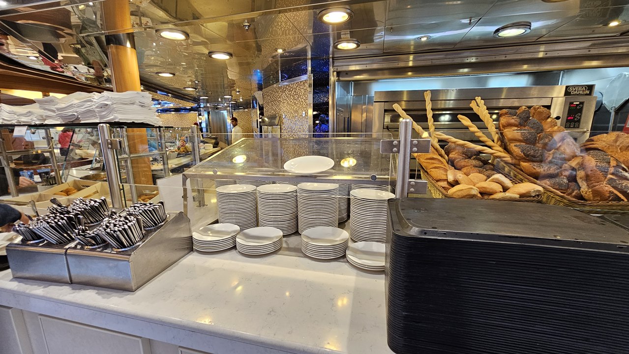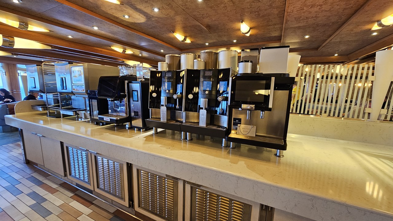 Nach der Veranstaltung zeigt sich doch ein kleines Hüngerchen. Ein schneller Kaffee muss her. Wir landen im Buffetrestaurant auf Deck 9, hier gibt es irgendwie immer was zu essen. Oh, was ist das? Da liegen auch kleine Berliner! Das ist genau das richtige für jetzt. Ein Kaffee und ein – na ja, vielleicht zwei – Berliner. Lecker gefüllt mit unterschiedlichen Marmeladen und Cremes. Schade, dass wir die erst jetzt gefunden haben. Hätten wir sicher öfter gegessen 😉