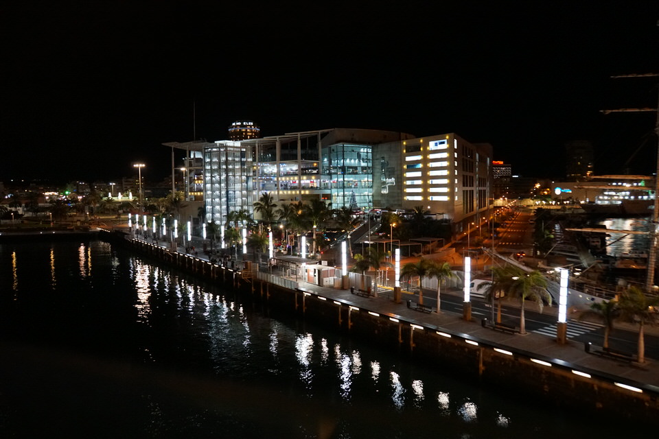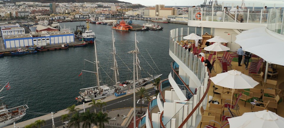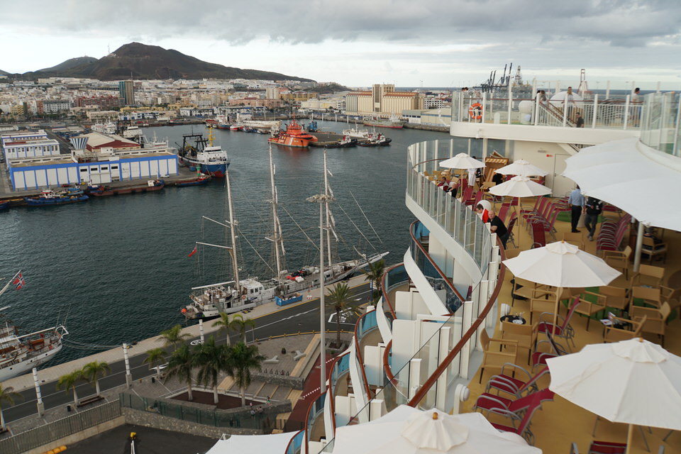 Unsere nรคchste Station ist natรผrlich das Pooldeck. Wir stellen schnell fest: Fast รผberall gibt es hohe Glasfronten, รผber die man nicht drรผber schauen kann. Nur am Heck gibt es die Mรถglichkeit direkt รผber die Reling zu blicken. Am Horizont ziehen dunkle Wolken auf. Eigentlich wollten wir noch kurz durch Las Palmas schlendern, aber wir entscheiden uns spontan wegen des Wetters an Bord zu bleiben und das Schiff zu genieรen.