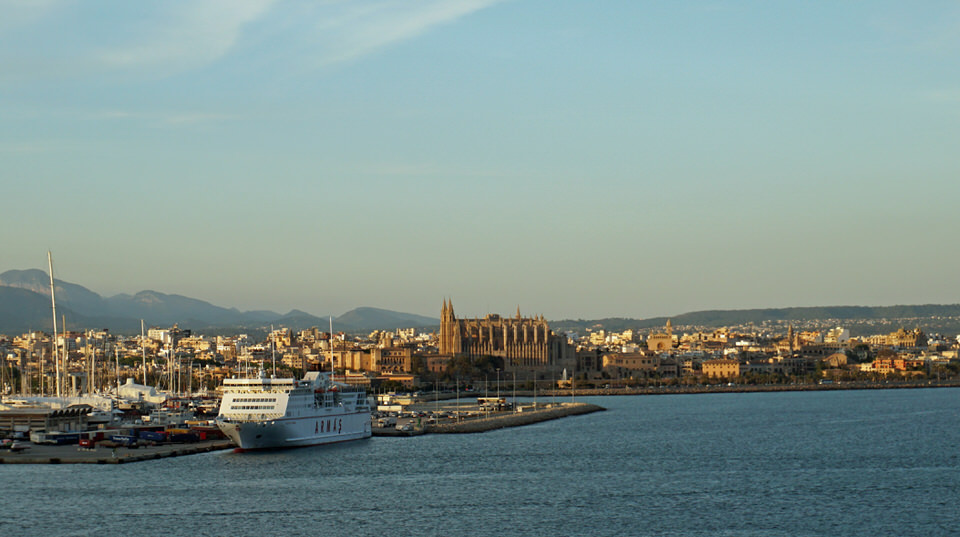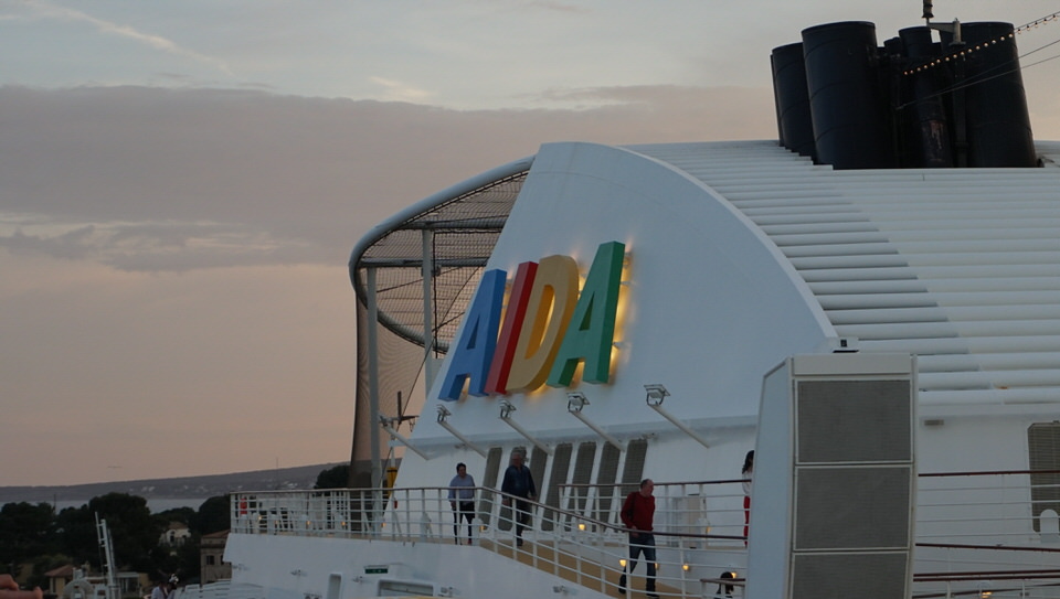 Nach dem Essen machen wir einen Spaziergang an Deck. So langsam geht die Sonne unter und Palma erscheint in einem warmen Licht. Sehr schön!
