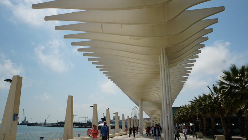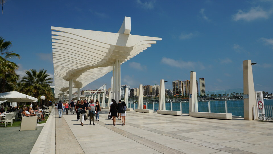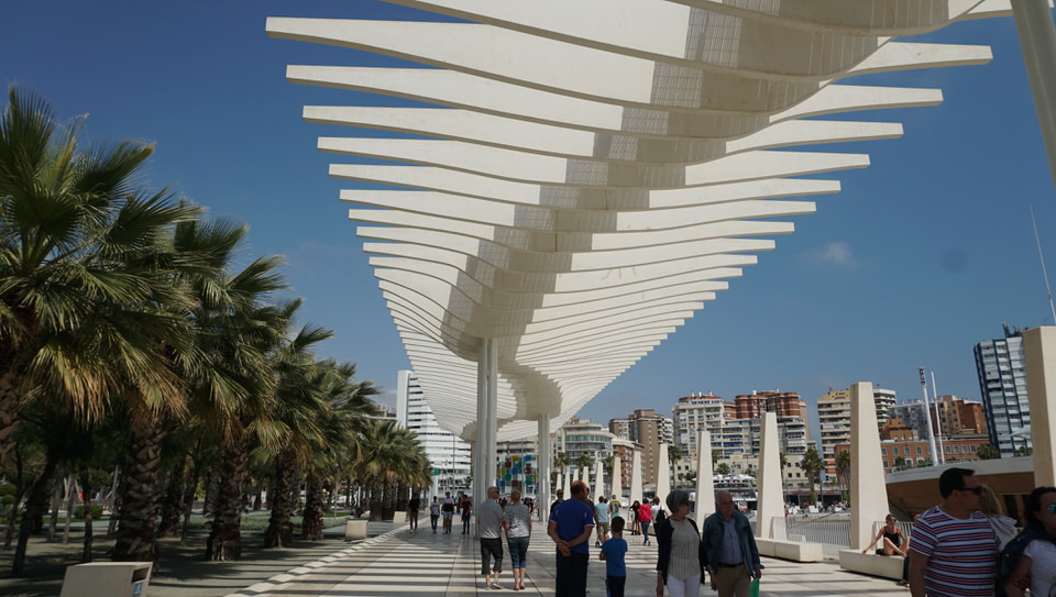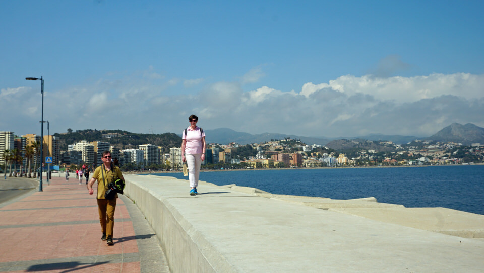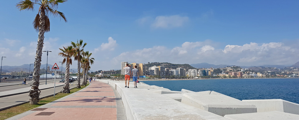 Die Drei laufen ein Stück der Pier entlang. Der Weg in die Stadt zieht sich ganz schön, gut dass wir mit dem Solar-Express gefahren sind. Der Ausblick auf Málaga und das Meer ist einfach toll!