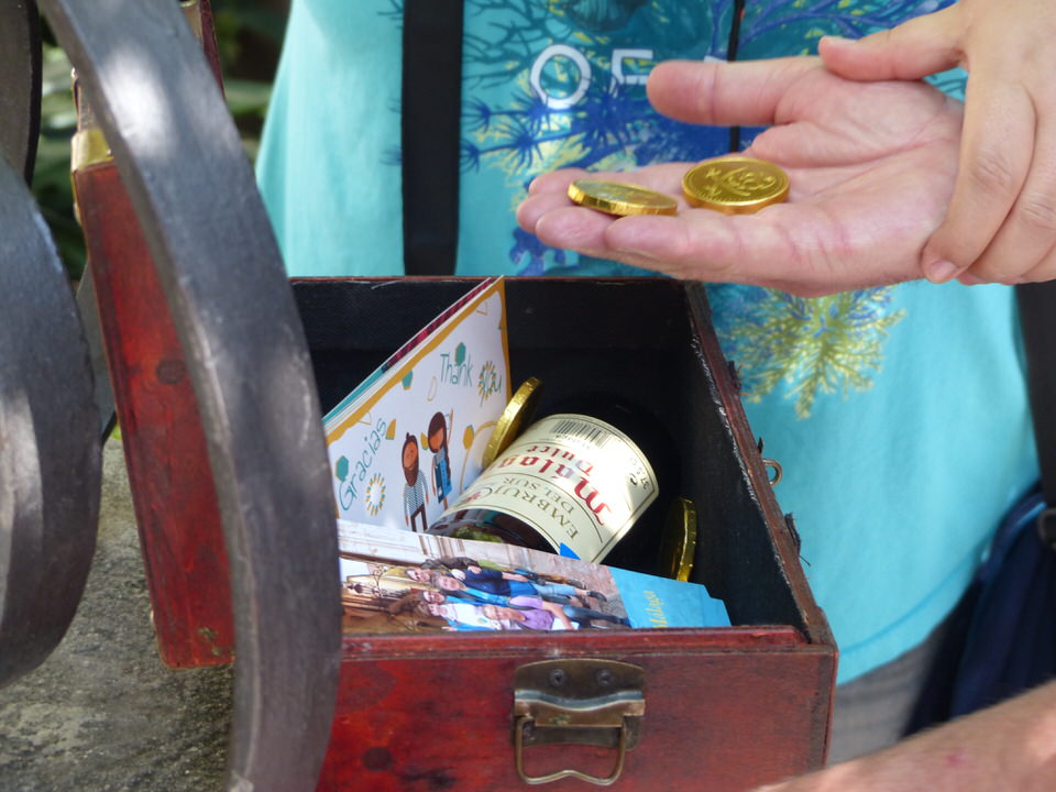 Nun haben wir noch 4 Stationen zu erkunden. An der vorletzten Station wird es tricky. Wir müssen ein Rätsel lösen, sowie ein Zahlenschloss öffnen. Das Rätsel ist ganz schön schwierig, wir tüfteln und diskutieren, raufen uns die Haare 🙂 Und kommen nicht drauf… wir müssen tatsächlich den Telefonjoker ziehen! Mit einem kleinen Tipp wird es ganz plötzlich klar und ist ganz einfach 🙂 Hätte man auch selber drauf kommen können. Wir schieben es auf die Hitze 🙂