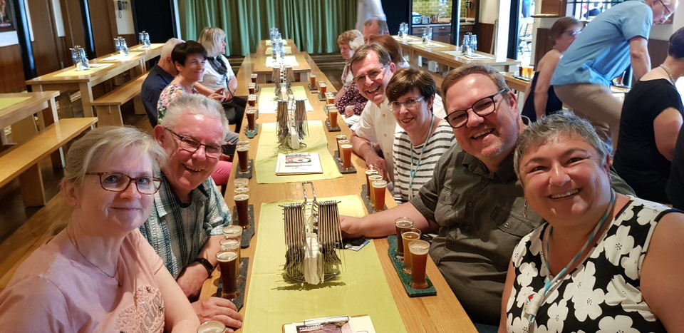 Es geht los! Insgesamt 32 Personen – darunter Juli, Greg, Simi, Mac, Astrid und ich – starten mit der Inside-Tour um 15:45 Uhr im Brauhaus mit einem Blick hinter die Kulissen des Brauhauses und einer Spezialität des Brauhauses: Eine Trilogie des Bieres (Zwickel; Hövels und ein Aktion Bier – heute der Maibock). Der Braumeister erzählt Wissenswertes rund ums Bier.