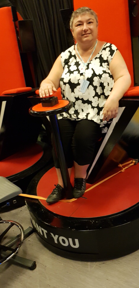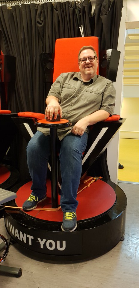 Wir kommen beseelt zurück in die Vinothek, wo wieder Alkohol angeboten wird. Diesmal Rotwein. Den lassen wir aber links liegen, sonst bekommen wir gar nichts mehr mit. Wir haben noch ein paar Stationen vor uns. Wir laufen über Treppen im Inneren des Schiffes durch den Crewbereich nach unten in den Backstagebereich des Theaters. Hier zeigt man uns den Bühnenunterbau („Down Under“). Die fahrbare Bühne ist das Herzstück des Theaters. Der erste Bühnentechniker demonstriert die Hebebühne – sehr interessant. Es stehen auch ein paar Requisiten der unterschiedlichsten Shows herum. Wir können nicht anders und setzen uns auf die Jury Stühle von der Show „Voice of the Ocean“ und werden von dem Technicker sofort verjagt 🙂 Nicht anfassen!