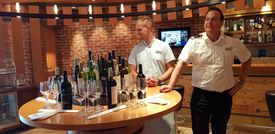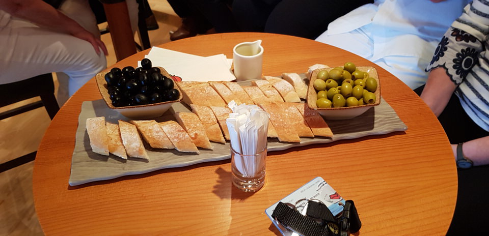 Wir werden in zwei Gruppen aufgeteilt. Die erste darf sofort auf die Brücke, wir legen einen Zwischenstopp in der Vinothek ein. Ihr merkt schon, die Inside Tour ist für Nichtaloholiker ungeeignet 😉 Wir bekommen zwei Weißweine kredenzt, einen trockenen und einen halbtrockenen. Mir eigentlich egal – ich erkenn da eh nicht wirklich einen Unterschied. Die Oliven, die dazu gereicht werden und das Brot entsprechen da schon eher meinen Geschmack 🙂