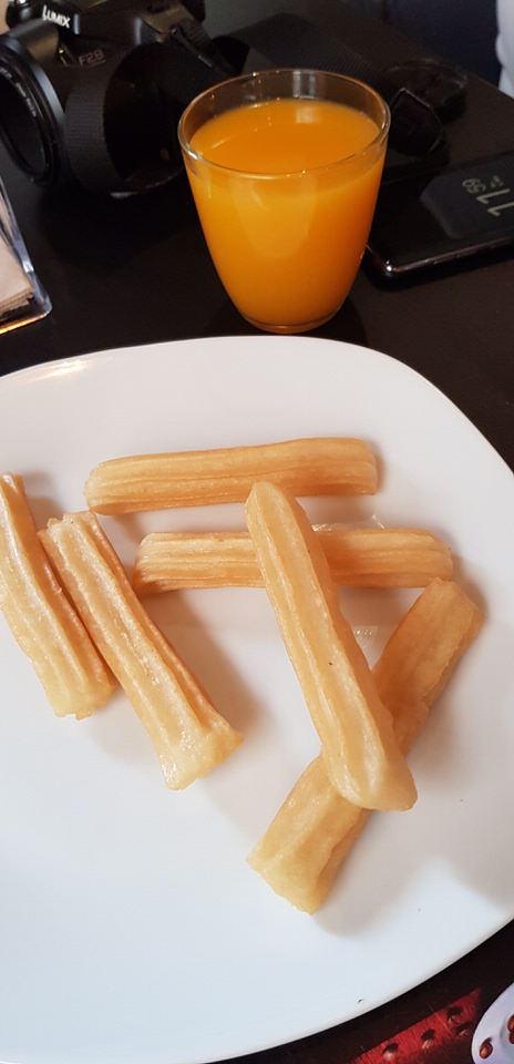 Unsere Füße freuen sich über die Pause. Und natürlich probieren wir eine spanische Spezialität „Churros“. Okay, ist irgendwie nicht unser Geschmack. Aber der frisch gepresste Orangensaft ist der Hammer!