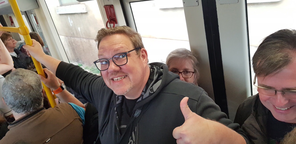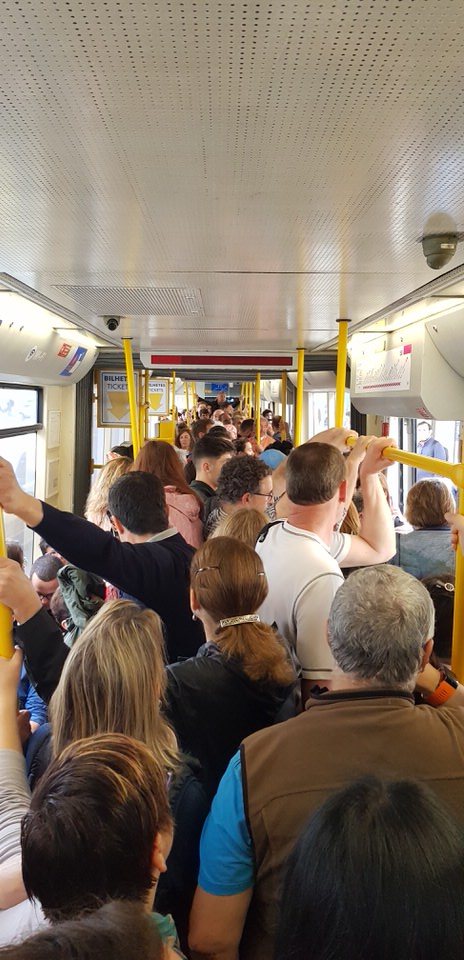 Mit uns will gefühlt die halbe Stadt in die selbe Richtung. Die Bahn ist proppevoll. Wir finden nur noch einen Stehplatz, die letzten Leute werden in die Bahn geschoben. Umfallen ist nicht möglich, so viele Menschen sind in der Bahn. Und alle wollen zum Hieronymuskloster. Wir fahren bis zur Haltestelle „Hieronymuskloster“, das sind 15 Stationen mit knapp 30 Minuten Fahrzeit.
