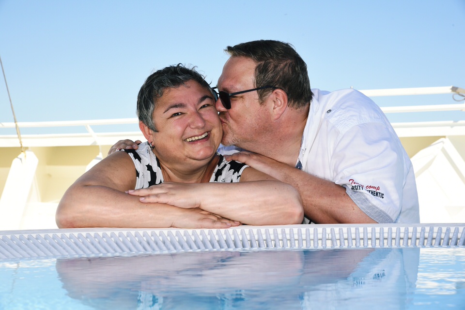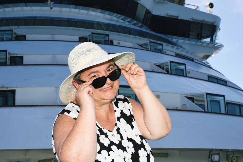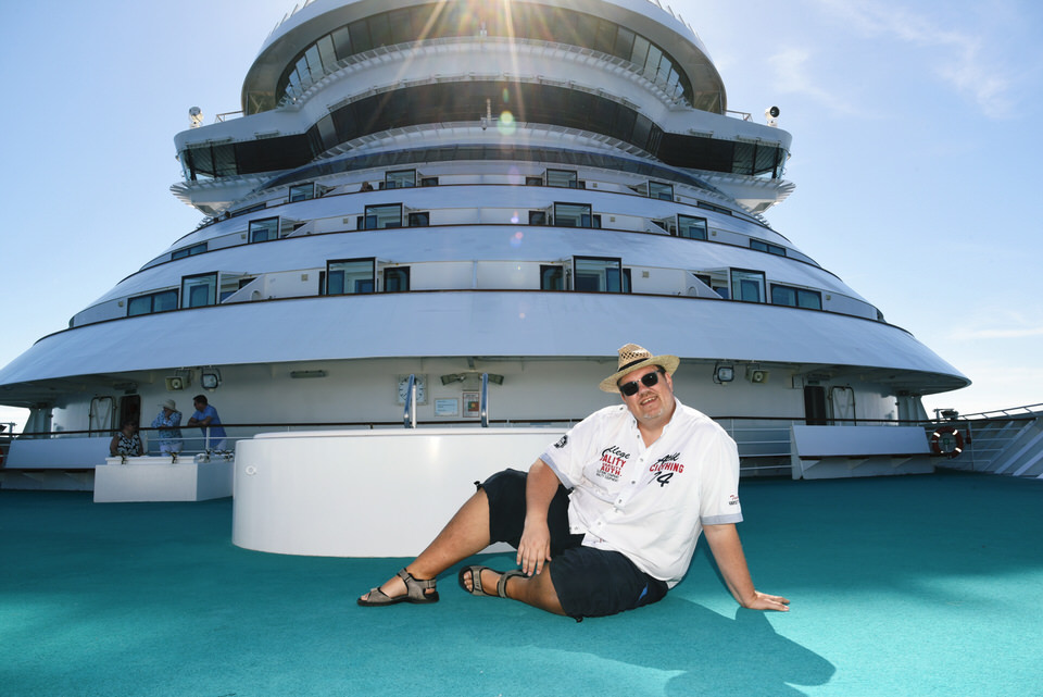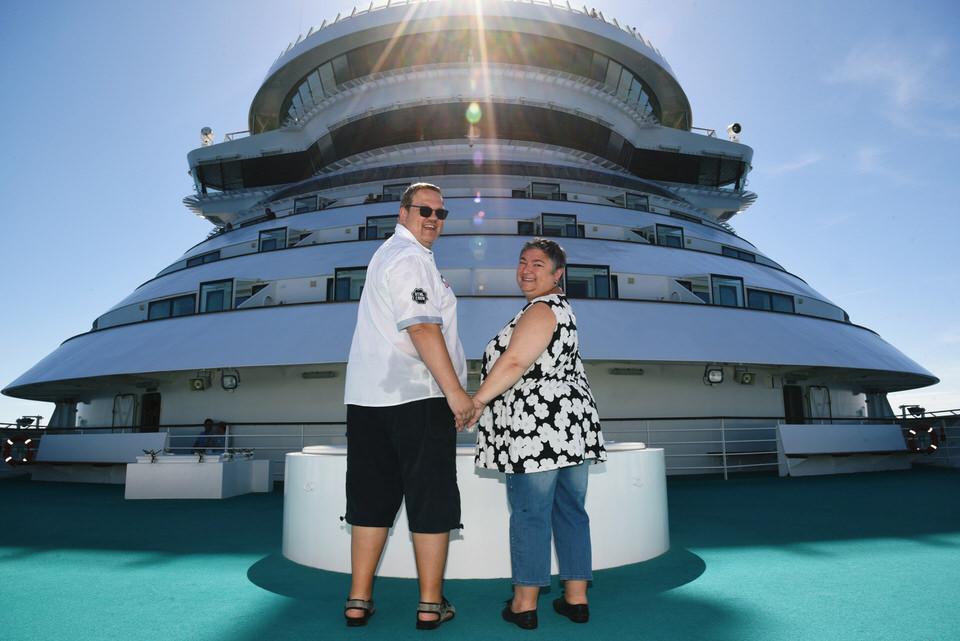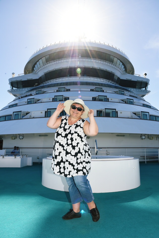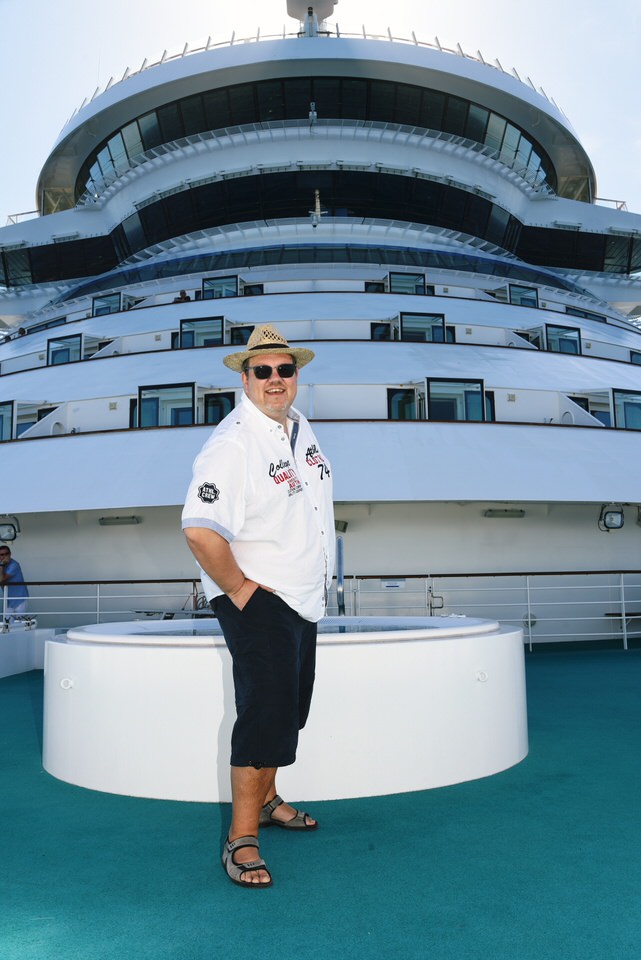 Die Kapitänsfragestunde auf dem Pooldeck fällt leider aus „operativen Gründen“ aus, schade. Dafür suchen wir uns ein anderes Highlight: Wir buchen spontan ein Fotoshooting am Bug von AIDAstella. Juli und Greg kommen auch mit. Wir haben viel Spaß und die Fotos sind extra klasse geworden.