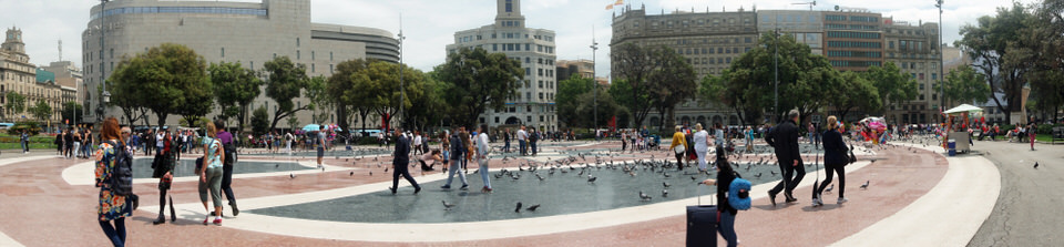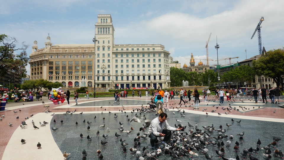 Am Plaça de Catalunya angekommen schlendern wir über den weitläufigen Platz, mitten durch eine riesige Schar Tauben.