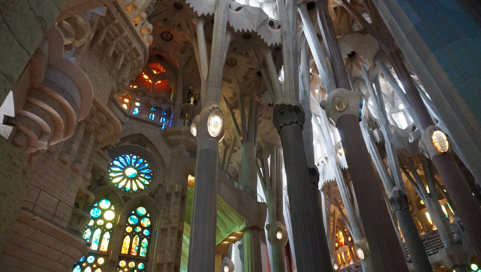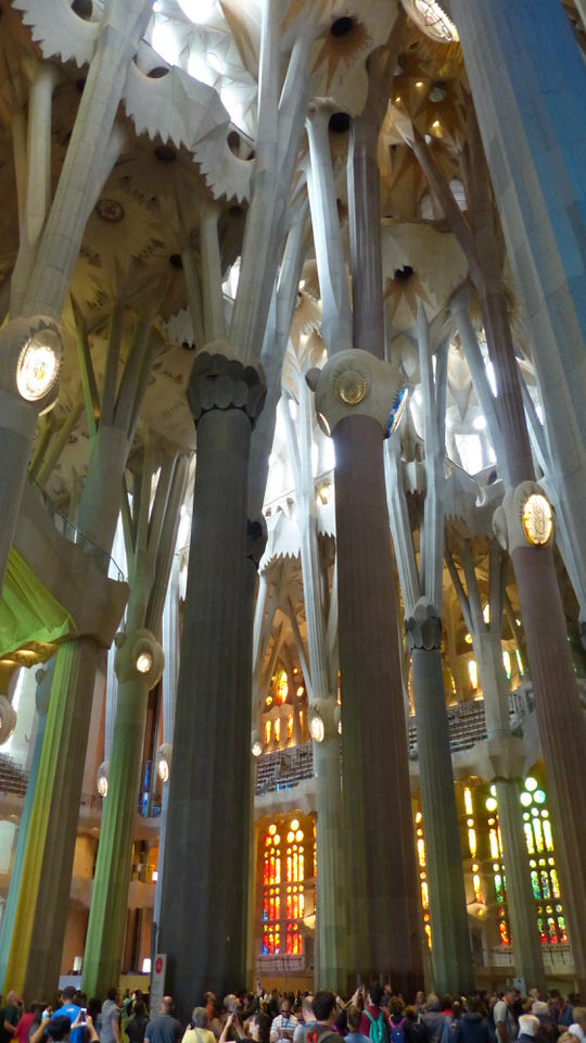 Die Gewölbe werden von riesigen steinernen Säulen getragen. Sie sollen an Bäume erinnern und besitzen deshalb an ihren oberen Enden Verzweigungen, die sich wie Baumstämme in Äste aufteilen. Das Ganze sieht aus wie ein Blätterdach 🙂