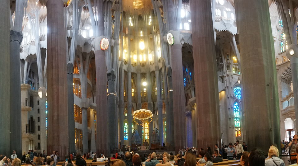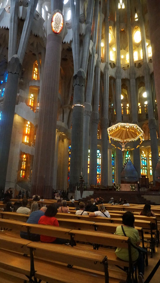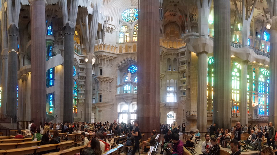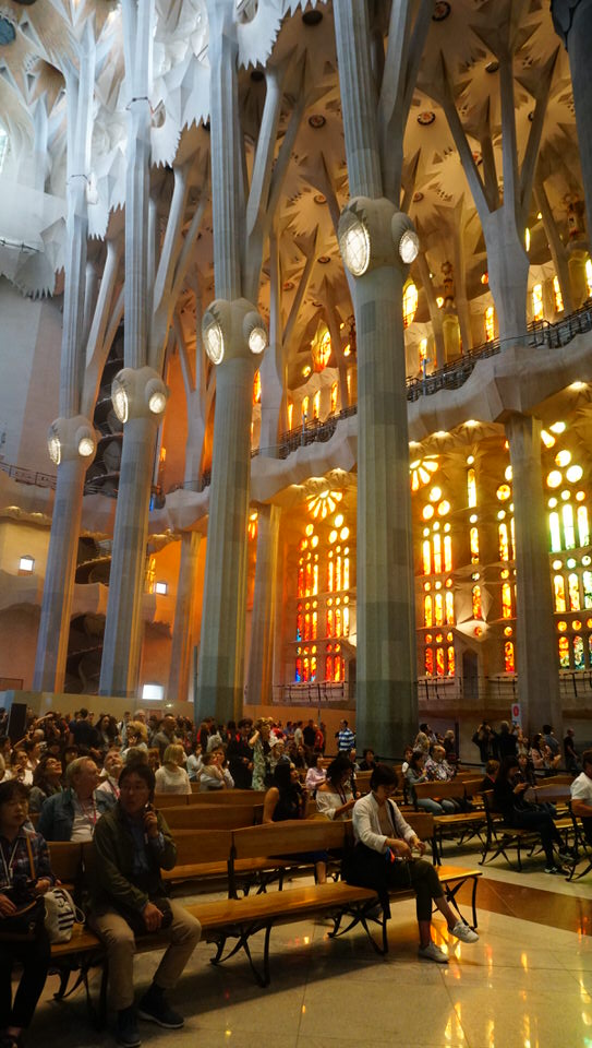 Jetzt erkunden wir den Innenraum der Sagrada Família – es ist unbeschreiblich. Unser Mund steht vor Staunen offen! Das Spiel mit dem Licht und die Architektur – uns fehlen die Worte. Wir haben schon sehr viele Kirchen gesehen, aber so etwas … Wir können uns kaum sattsehen.