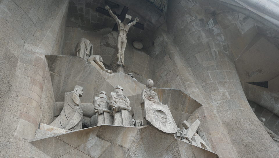 Die nach Südwesten ausgerichtete Passionsfassade wurde nach Gaudís Tod begonnen und ist unvollendet. Sie unterscheidet sich von ihrem Gegenstück dahingehend, dass sie kaum Verzierungen enthält und mit klaren, geometrischen Linien und großen Figuren übersichtlich aufgebaut ist. Sie wird von sechs schrägen Säulen gestützt und hat drei Portale.